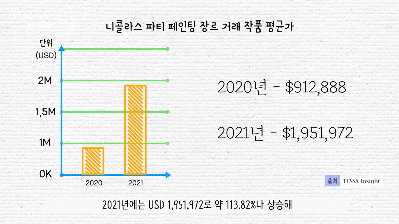 실제로 파티도 하우저 앤 워스 발탁 이전부터 컬렉터 사이에선 관련 소문이 돌았던 터라 작품에 이목이 쏠리고 있었다. 2019년에만 33점이나 경매시장에 공개되기도 했다. 더 나아가 2020년과 2021년 사이에 니콜라스 파티의 '페인팅 장르' 경매 기록을 살펴보면 총 거래금액, 거래 횟수, 작품 평균 금액 등 다양한 지표가 가파르게 상승했다.