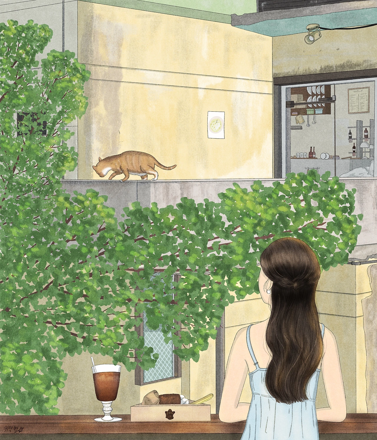 큰 창가쪽에 자리했다. 맞은편에 보이는 건물은 많이도 낡았다. 그렇지만 그런대로 감성적이게 보였다. 그리고 그 건물 옥상 위로 고양이 한마리가 지나갔는데 임신을 한 모양인지 배가 볼록했다.