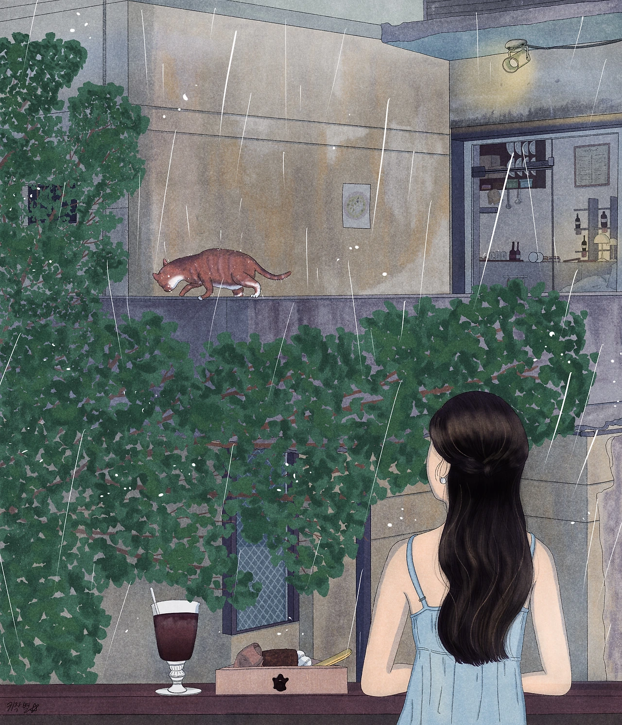 비를 내리고 채도와 명도를 낮추며 조금 더 차가운 색조로 바꾸니 맑은 하늘아래에서는 자유로운 고양이였는데 이 그림속에서는 왠지 쓸쓸하게 보인다.