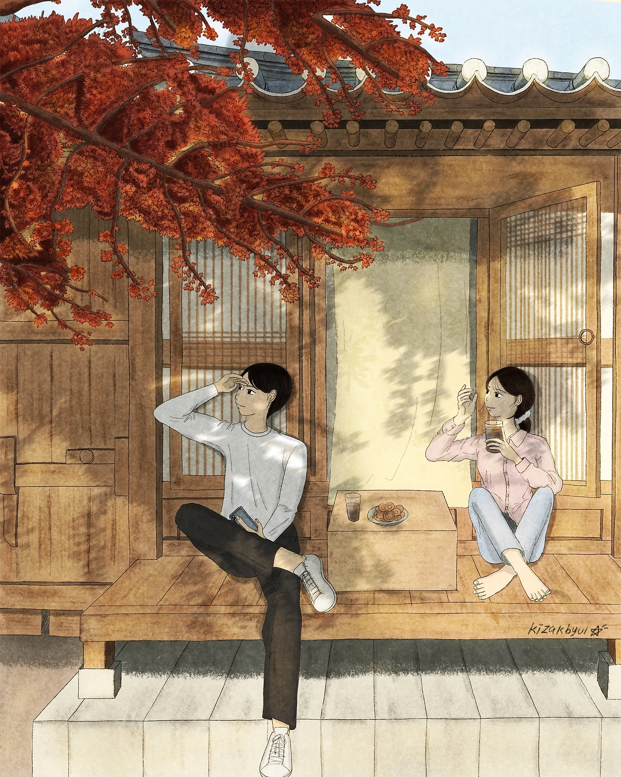 날씨가 참 좋아서 그런 좋은날씨를 그려보고 싶었다. 가을단풍과 가을햇살이 참 잘 어우러질듯한 한옥을 배경으로 그림을 그려나갈 때 그림이 점차 완성되어가면 미소가 지어졌다.
