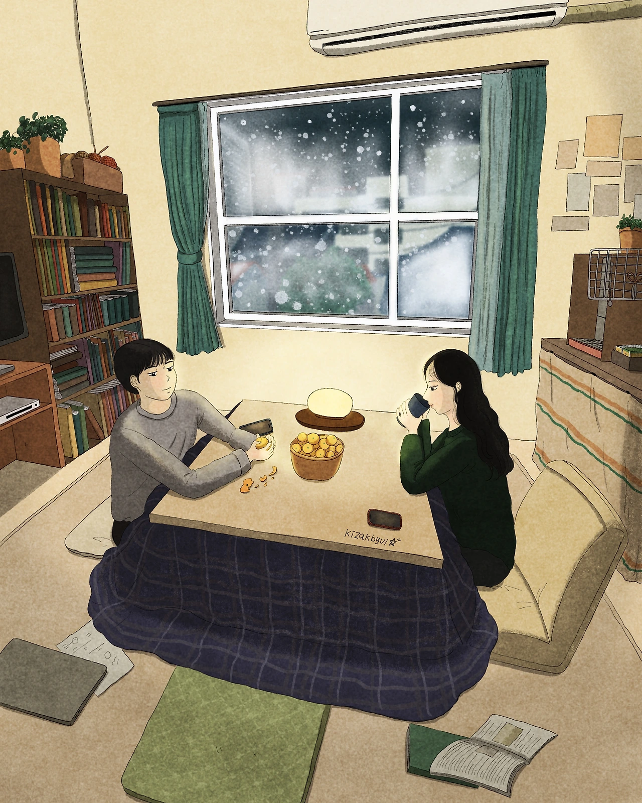 유난히 눈이 오고 추웠던 날, 코타츠 사진을 보고 “아! 방 안에서 코타츠 이불을 덮어 따스한 공간에서 귤을 먹는 사람의 모습을 그려야지!“라는 생각으로 그림의 구도를 잡고 그리게 된 그림입니다.