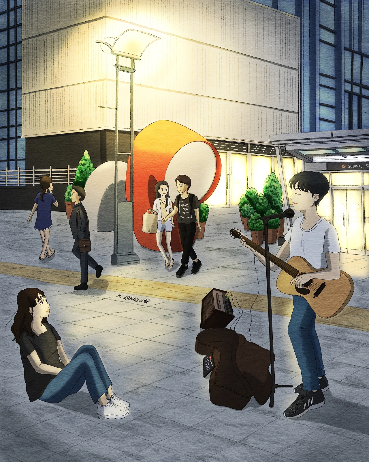 꿈을 추구하고, 그 과정이 험난한 두 청춘이 포기하지 않고 나아가기 위해 서로에게 위로와 힘이 되어주는 모습입니다. 책 속에서는 해당장면이 “같이 걸을까”라는 노래로 버스킹을 한다고 나옵니다.