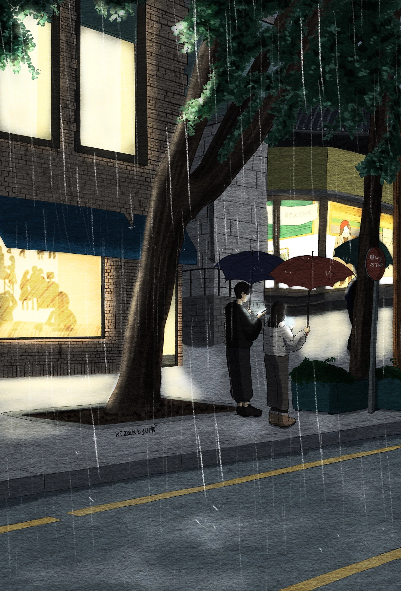 무엇을 그릴지 고민하던 날, 금요일에 비가 왔었다. 비가 오는 모습을 보고 지금까지 내가 비가 오는 풍경을 그려보지 않았다는 것을 깨달았다. 그래서 비가 오는 일상의 풍경을 그렸다.