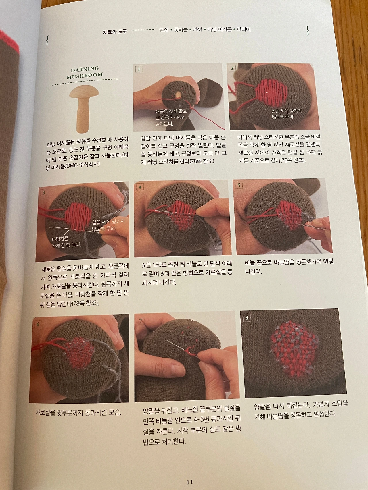 워크숍 당일 예쁜 천들과 함께 놓여 있던 ‘꿰매는 생활’이라는 책에는 발뒤꿈치만 해진 양말을 예쁘게 꿰매는 방법이 나와 있었다. 물론 나도 살짝 구멍 난 양말을 꿰매신기는 했지만 어느샌가 그 꿰맨 양말은 서랍 구석에 밀어 넣고 새양말을 사게 된다.