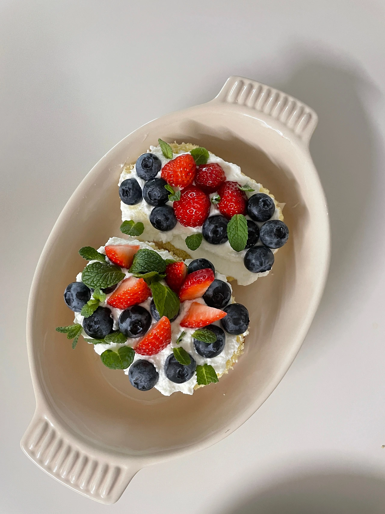 케이크 시트를 카스테라 빵으로 대체하니 오븐은 필요 없다. 빵칼로 카스테라 빵을 얇게 여러 겹으로 잘라준다. 그리고 사이사이에 마스카포네 치즈를 펴 바르고 슬라이스 한 딸기도 끼워준다. 휘핑크림을 사서 올려도 되지만 약간의 수고를 더하면 맛이 배가되기에, 우유갑에 든 생크림을 사서 직접 휘핑을 친 생크림을 올리자. 그리고 딸기와 블루베리를 예쁘게 올리기만 하면 끝. 마지막으로 완성된 케이크 위에 애플민트 잎을 올리니 새싹이 돋아나는 듯 파릇파릇하다.