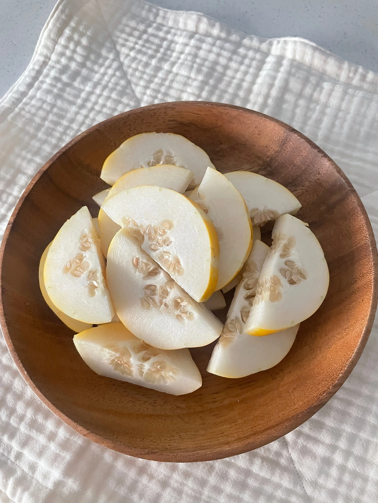 딸기를 점점 한겨울에 먹다 보니 겨울 과일인 줄 알고 있지만 딸기는 25℃ 이하의 선선한 기후를 좋아할 뿐 아무런 시설이 없는 곳에서 제대로 익으려면 5월 이후가 된다고 한다. 딸기와 비슷한 것이 참외. 어릴 때는 한 여름 무더위에 땀을 뻘뻘 흘리며 수박과 함께 먹던 대표적인 여름 과일인데 언제부터인가 날씨가 따뜻해지면 서둘러 마트 과일코너 한자리를 차지하고 있다. 아직 노지에서 제철에 재배된 것이 아닌 줄 알지만 노랗고 귀여운 참외를 지나칠 수 없어 한살림에 들어온 껍질째 먹는 참외를 집어 든다. 참외는 90% 이상이 수분이고 식이섬유가 풍부해 포만감이 뛰어나 다이어트에 좋은 과일이다. 그리고 참외의 영양성분은 껍질에 대부분 들어있기 때문에 깨끗이 씻어 꼭 껍질과 함께 먹어야 한다.