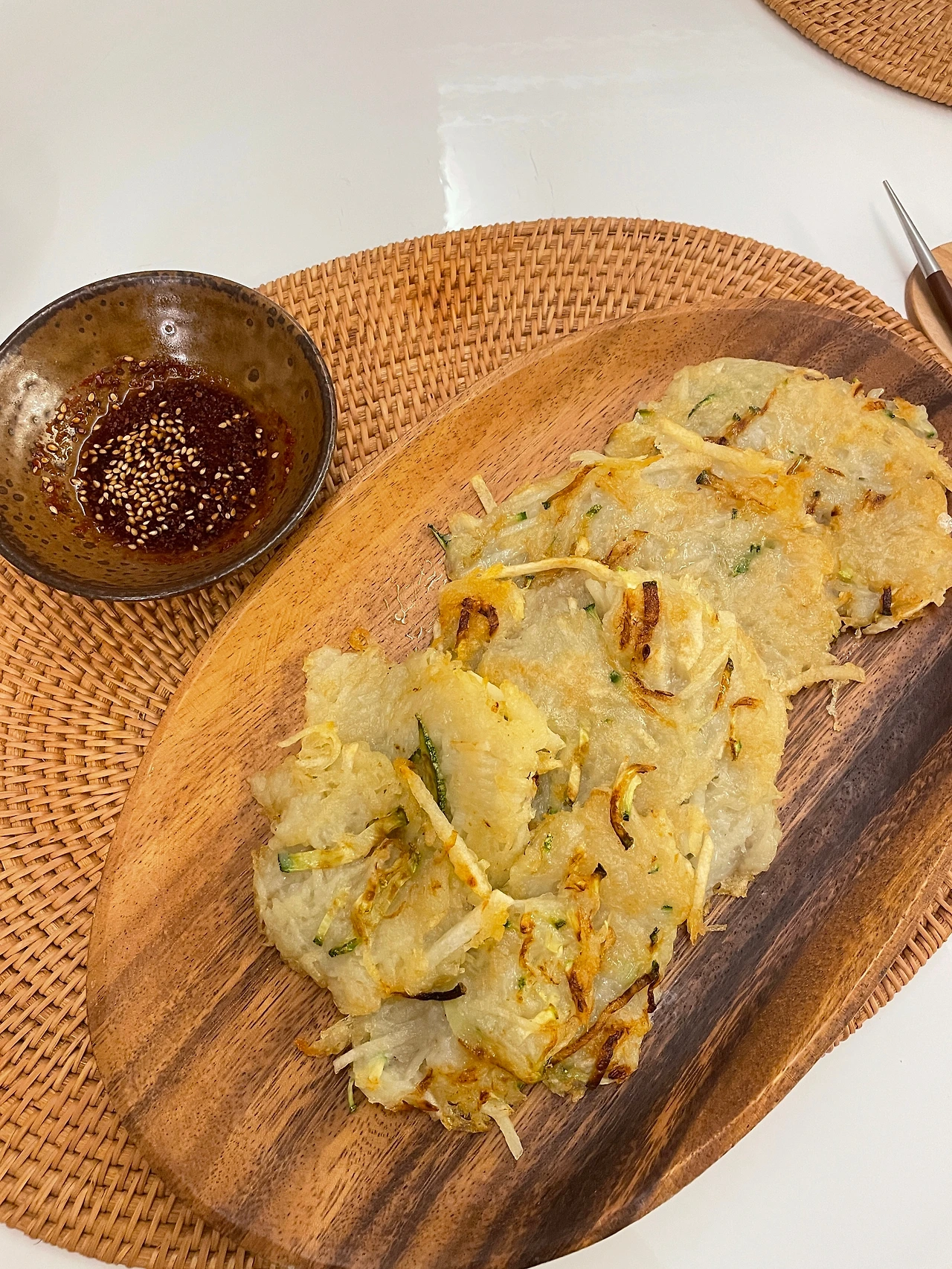 감자를 강판에 간다. 손이 다칠 염려가 있는 끝 부분은 채를 치면 된다. 어쩜 이리 쫀득쫀득하지 싶을 만큼 맛 좋은 감자전. 애호박이 있다면 조금 넣어도 좋다. 감자전에 소금 간을 했어도 찍어먹는 간장이 빠지면 섭섭하다.
