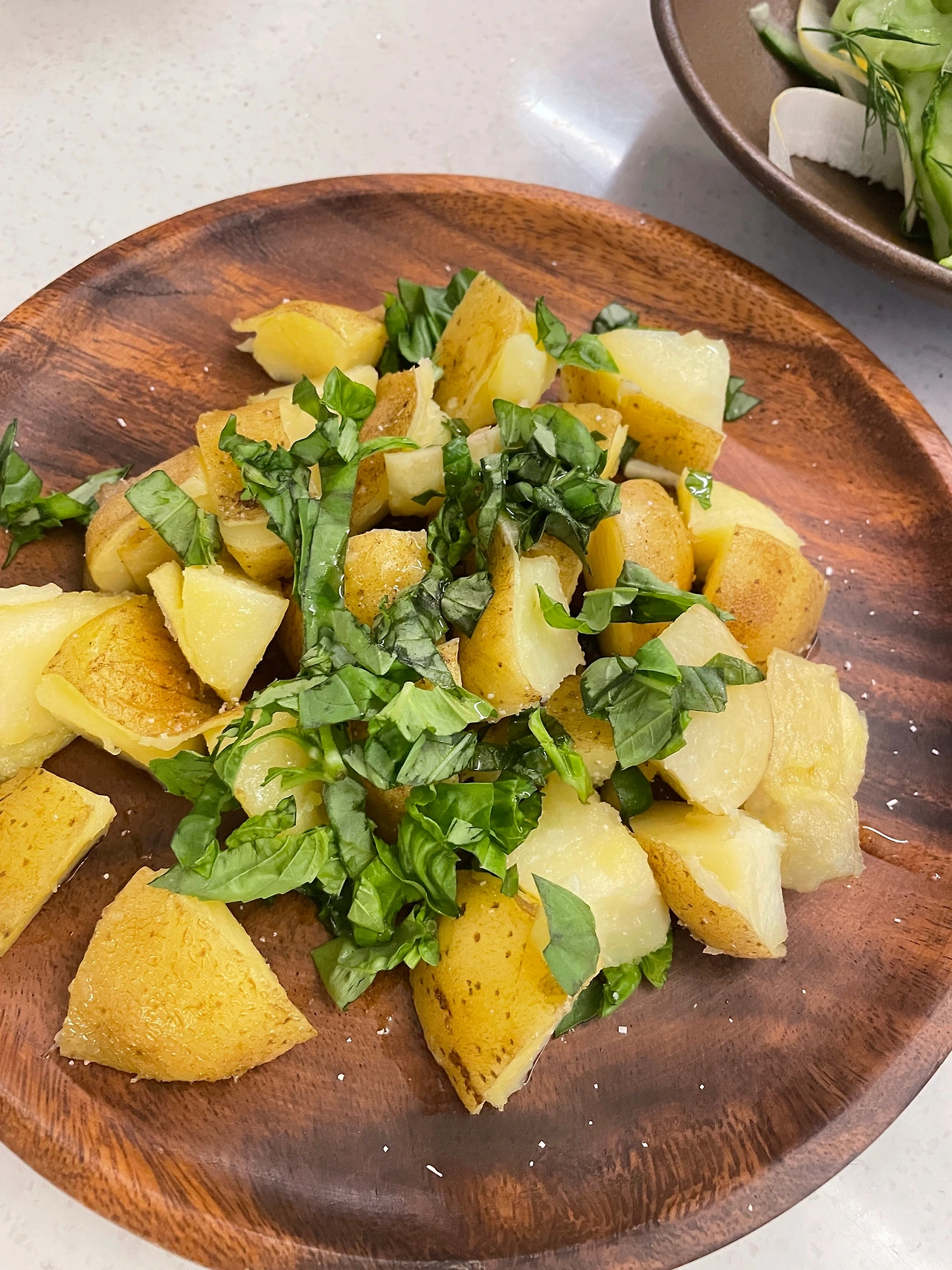 감자를 폭 쪄내 올리브 오일을 두르고 소금간만 하고 바질을 듬뿍 썰어 올린다. 시간이 좀 더 있다면 쪄낸 감자를 기름에 한 번 더 구워내면 훨씬 맛이 좋다.