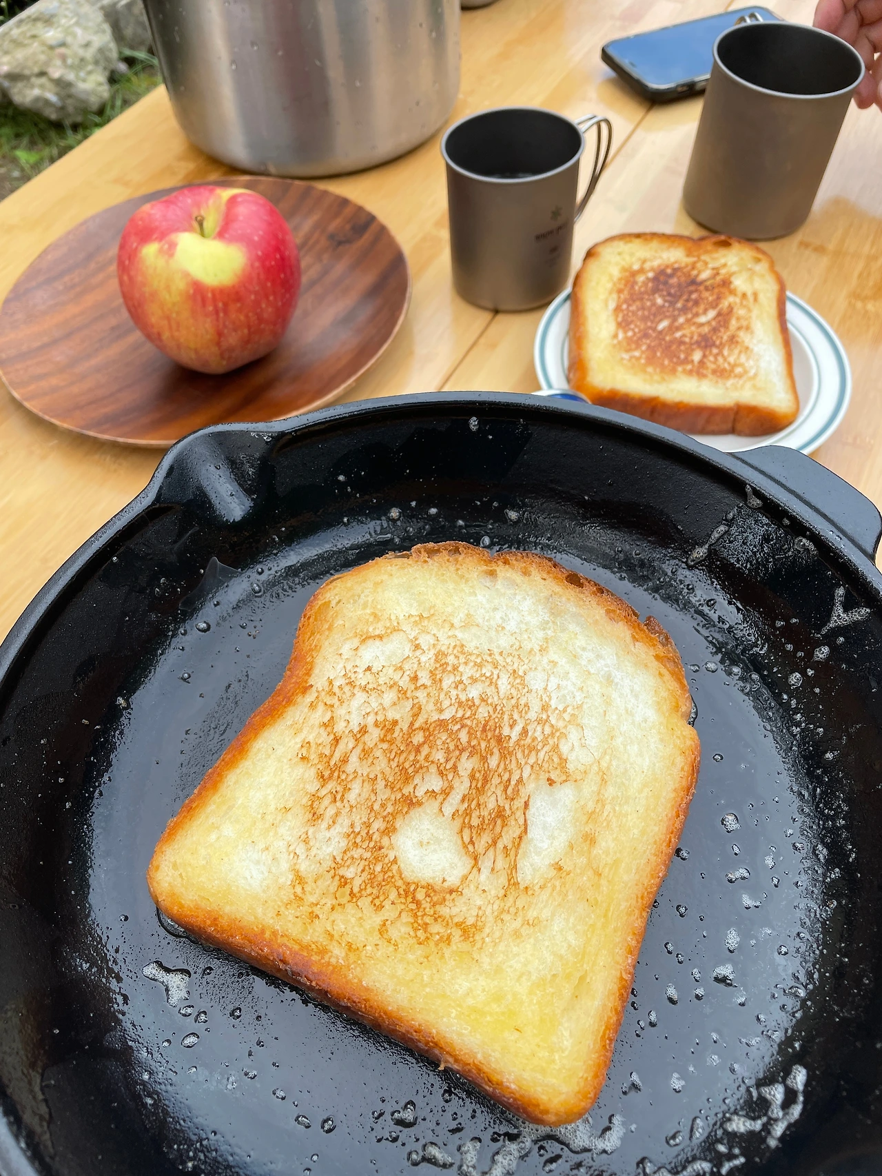 아침식사는 간단히 토스트와 사과. 만능 주물팬 하나면 캠핑에서는 모든 요리가 가능하다. 집에서는 아침부터 버터가 잔뜩 묻은 프라이팬을 닦는 수고로움이 귀찮아서 잘 해먹지 않는 버터를 잔뜩 머금은 토스트를 먹음직스럽게 살짝 태울 정도로 굽는다. 이 토스트는 항상 한 장을 먹고 나면 아쉬움이 남아 한 장을 더 구워 반쪽씩 나누어 먹는다. 커피 한잔을 더 내려서 마시고 굳이 챙겨 온 책을 펴 들고 느릿느릿 하루를 시작하는 그 시간이 벌써 그립다.