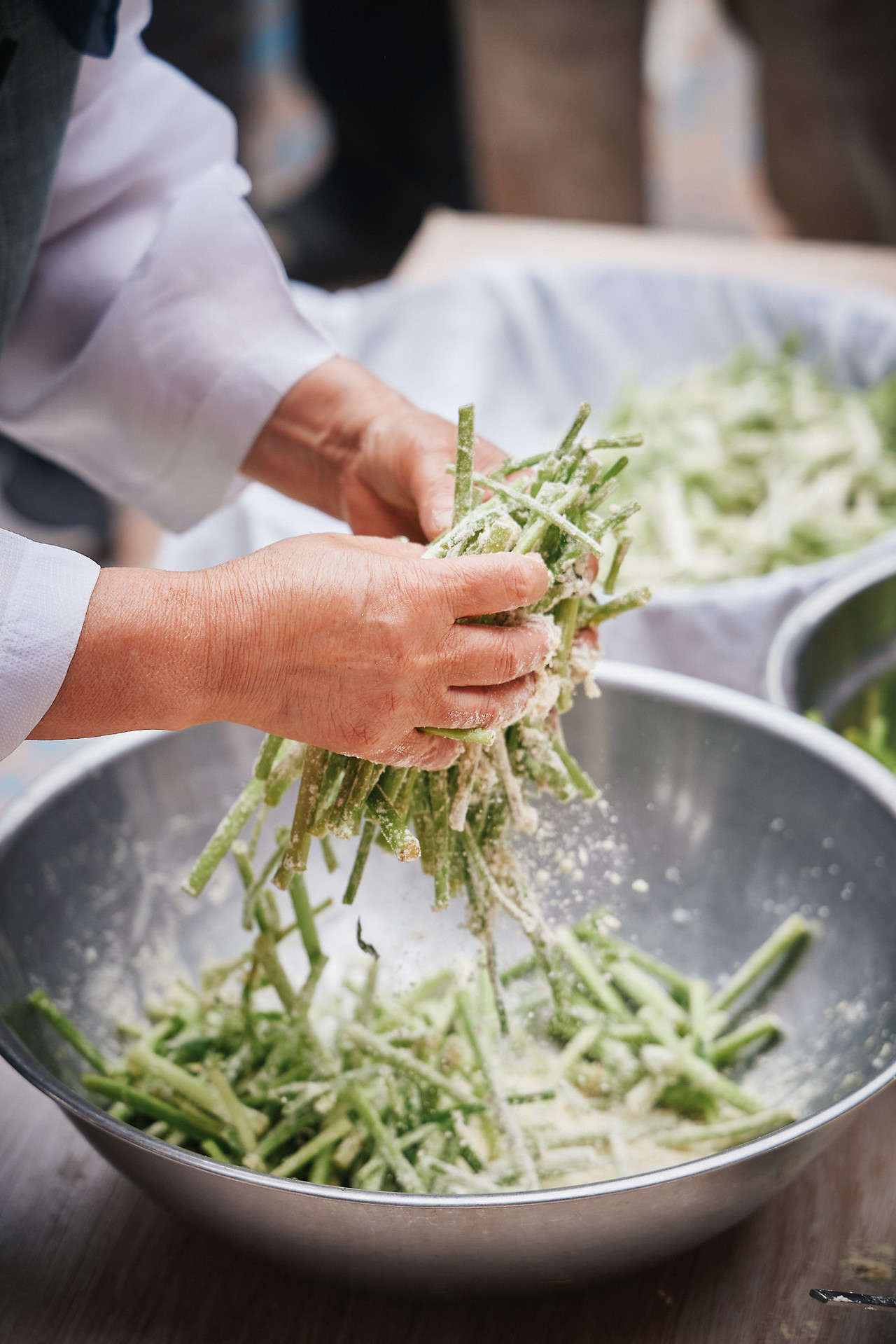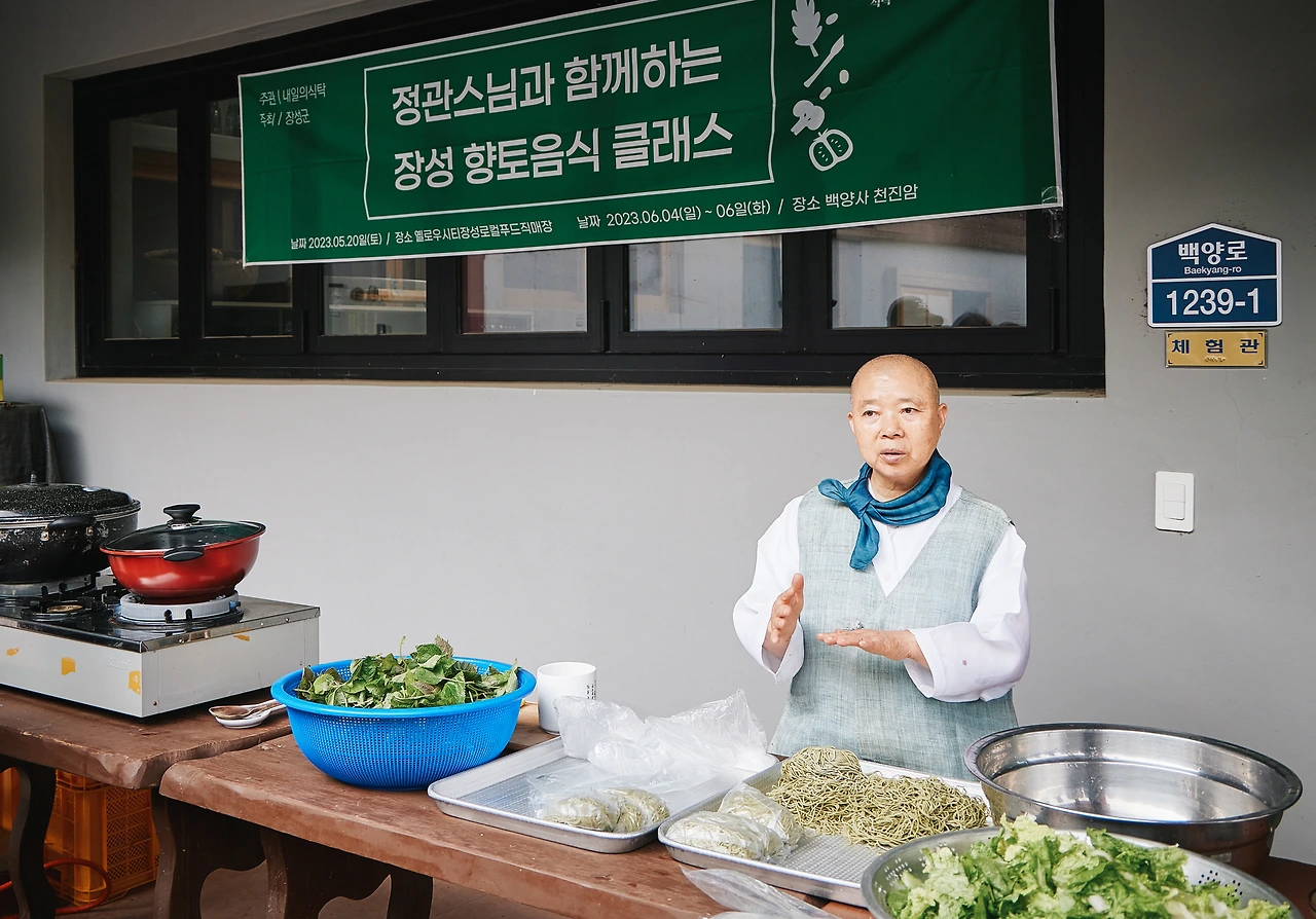 이른 새벽 아침공양을 하고 대여섯 시간 동안 쉼 없이 이어진 시연에 모두가 지쳐버린 시간, 스님께서는 저녁으로 간단히 국수를 말아먹자 하셨다. 그 흔한 멸치 한 마리 들어가지 않은 애호박과 배춧잎만 들어간 슴슴한 국수는 서른 명이 넘는 참가자들이 모두 한 그릇씩을 받고 나니 퉁퉁 불어 있었다. 종일 서서 재료 손질을 돕고 스님의 시연을 지켜보느라 고된 하루를 보낸 참가자들은 모두 양에 차지 않는 국수 한 그릇이 썩 마음에 들지 않는 눈치였다. 나 역시 김치전이라도 함께 부쳐주시지 하는 아쉬운 마음이 들었다. 그러나 이어지는 스님의 말씀에 음식을 만드는 것에 대해, 음식을 먹는 것에 대해 ‘음식을 대하는 마음’을 우리는 새롭게 할 수 있었다.