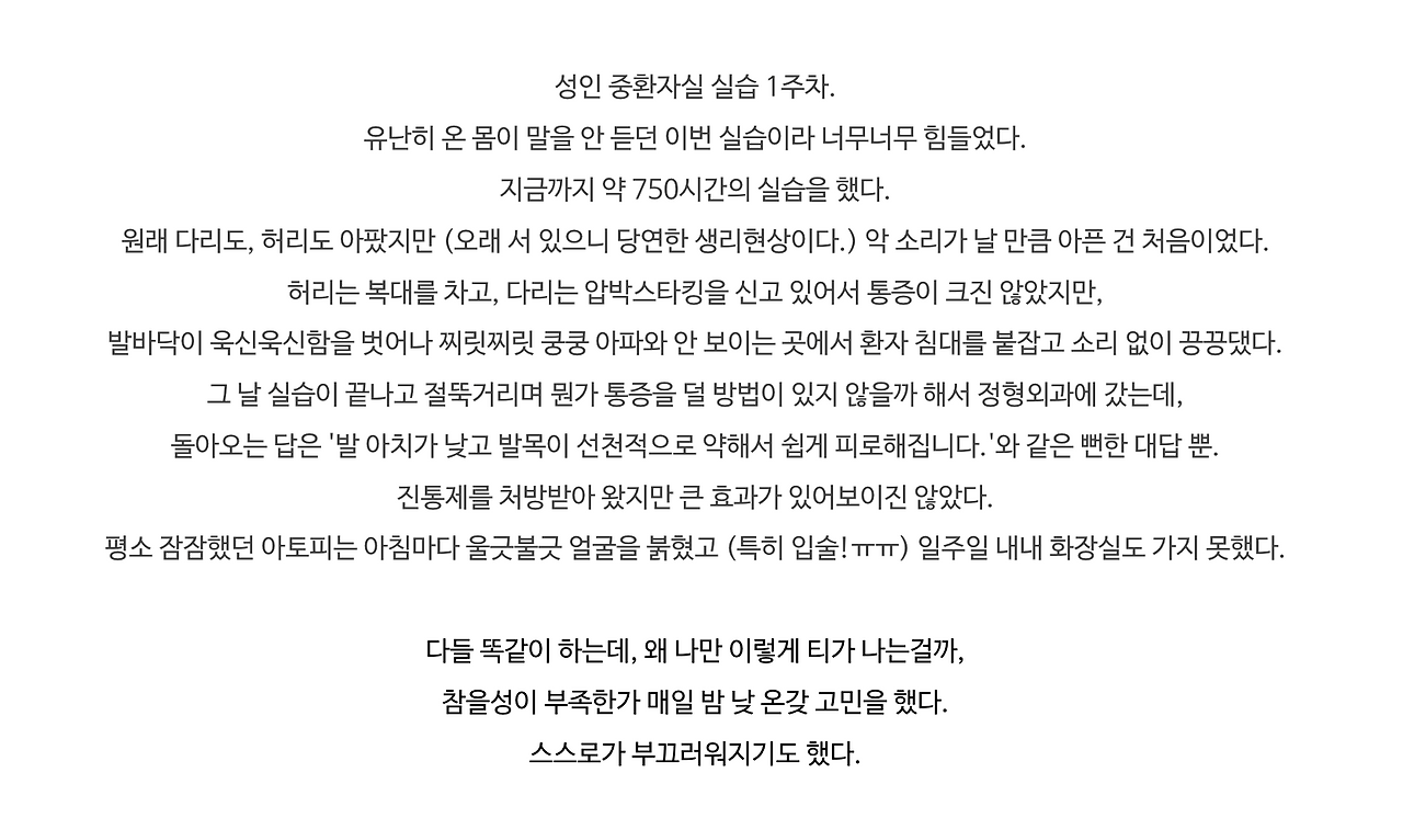 떨어진 자존감은 쉽게 회복되지 않았다. 간호학과를 다니며 1000시간의 실습 때도, 수술실에 발령을 받은 이후에도 크게 달라지지 않았다.
