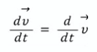 이 식은 위의 식과 동일합니다. 척 봐도 그렇게 생겼습니다. 분수의 분자에 있는 v가 옆으로 살짝 이동한 것이지요. 여기에서 '디 오버 디 티'라고 읽을 수 있는 부분의 의미는, 시간에 대한 미분을 의미합니다. 그러므로 '디 브이 오버 디 티'는 속도를 시간에 대해서 미분한다는 뜻입니다. 그럼 다시 저 위의 식으로 올라가 볼까요? '디 브이 오버 디 티는 에이' 번역하면,