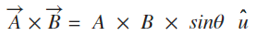번역하면, [두 벡터의 벡터 곱은 각 벡터의 크기를 곱한 다음, 거기에 두 벡터의 사잇각의 사인 값을 다시 곱한다. 그리고 이 값은 벡터이다. 그 방향은 단위 벡터인 유 방향이다.]
