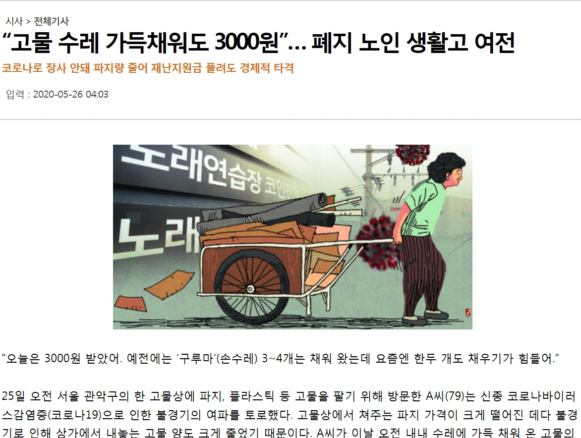 추운 겨울이고 더운 여름이고 버려진 폐지와 종이 상자, 플라스틱 등을 줍는 어르신들을 어렵지 않게 볼 수 있다. 동네를 돌아다니며 누군가가 버린 빈 병이나 신문지 등 재활용 가능한 것들을 모아 고물상에 내다 파는 일이다. 그렇게 하루 종일 발품을 팔아서 손에 쥐는 돈은 고작 몇 천 원이다.
