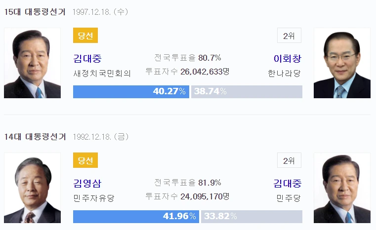 김영삼은 3당 합당으로 청와대에 입성했고 김대중은 DJP연합으로 결국 대통령이 되었다. 두 사람의 득표율은 모두 42% 미만이었다. (김영삼 41.96% 김대중 40.27%)