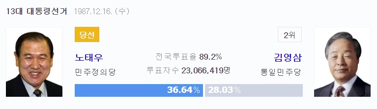 1987년에는 DJ와 YS라는 두 거물이 함께 양보 없이 겨루다 노태우가 어부지리를 누렸다. 그때 노태우의 득표율은 겨우 36%였다. 군사독재를 5년 더 일찍 끝낼 수 있었음에도 ‘보통사람’으로 포장한 전두환의 꼭두각시에게 정권을 내주고 만 것이다.