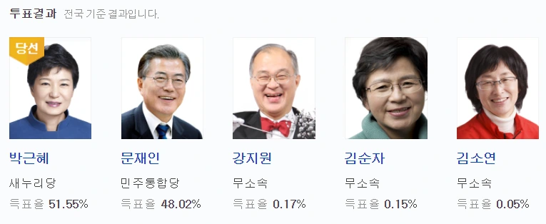 최근 25년간 7차례 대선에서 가장 높은 득표율을 기록한 당선자는 박근혜다. 박근혜는 절반을 넘는 51.55%의 득표율로 대한민국 최초의 여성 대통령이자 최초의 부녀 대통령이라는 기록마저 세웠다. 역대 가장 높은 득표율로 권좌에 올랐지만 아이러니하게도 가장 먼저 권좌에서 내려오는 기록을 세운 것도 박근혜다. 구중궁궐 청와대 관저에서 담을 쌓은 채 민심의 목소리에 귀 기울이지 않고 소통을 거부하다 탄핵을 자초한 비극의 대통령이었다.