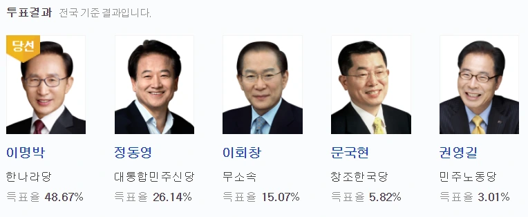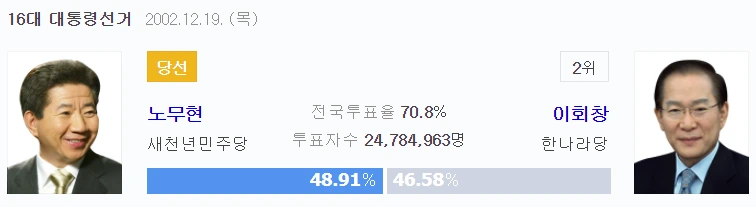 정몽준과의 단일화를 이끌어냈던 (막판에 정몽준이 철회했지만) 노무현 (득표율 48.91%)과 범 여권의 분열 속에 약체 후보와 맞섰던 이명박(득표율 48.67%) 만이 그나마 절반에 가까운 표를 얻었다.