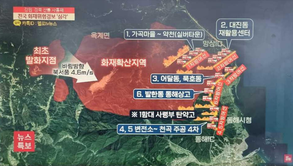 취재팀이 현장에 도착하기 전 산림청과 소방청에서 제공받은 화면을 보니 ‘불바다’였다. 낙타 등처럼 생긴 야트막한 동산 두 개가 시뻘건 화염에 휩싸인 채 훨훨 타는 모습은 충격적이었다. 마치 베트남전 당시 미군이 베트콩이 숨어든 밀림을 태우기 위해 화염방사기 수십 대로 불을 지르는 장면으로 착각할 정도였다. 2019년 고성과 속초 일대를 덮쳤던 ‘강원 산불’을 훨씬 능가하는 대규모 산불임을 직감하게 해주는 장면이었다.