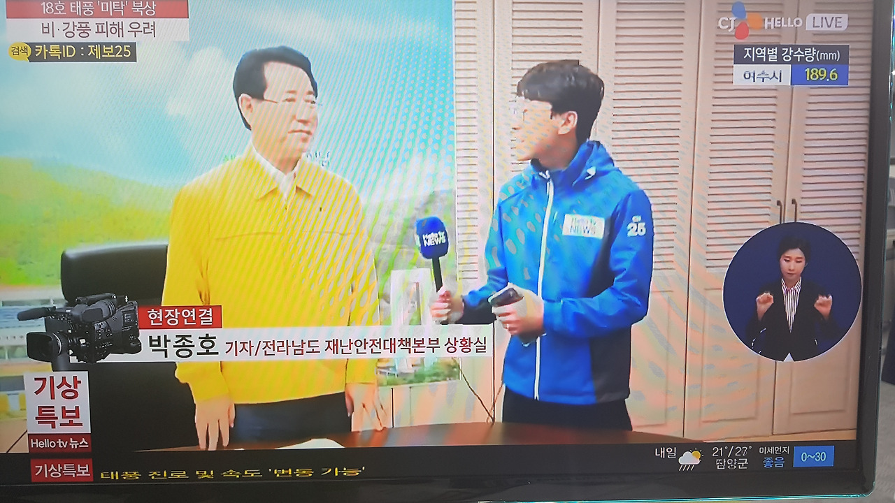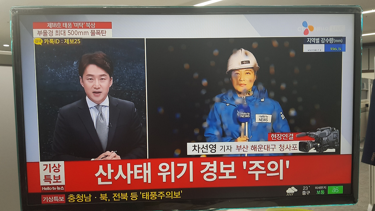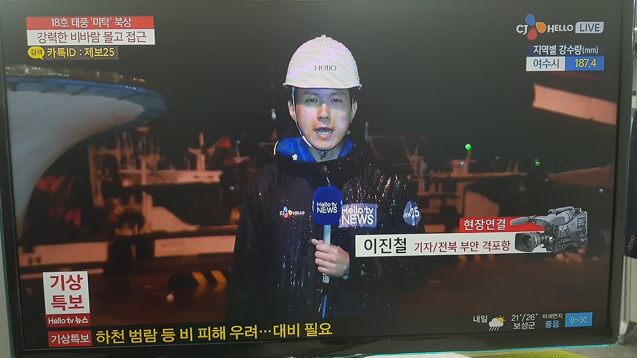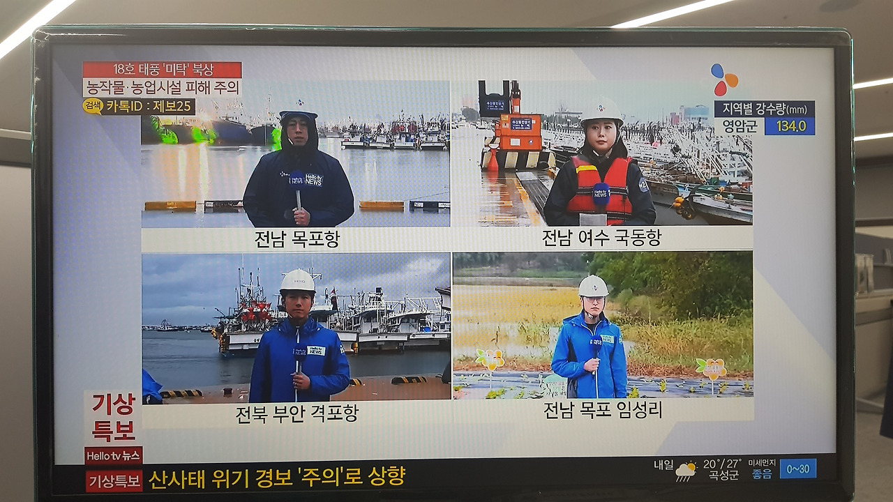 태풍 ‘미탁’의 관통은 예견된 일이었다. 2일 밤 목포에 상륙할 것이라는 예보에 CJ헬로 지역채널은 평상시처럼 특보 준비에 돌입했다. 호남미디어국(호남, 아라, 전북방송)을 시작으로 충남미디어국, 부경미디어국(부산, 경남, 가야방송), 경북미디어국(대구, 신라, 영남방송) 그리고 강원미디어국의 영동방송 등 총 11개 SO (지역 케이블방송사)와 상암동 본부에서 총 백여 명이 투입됐다.