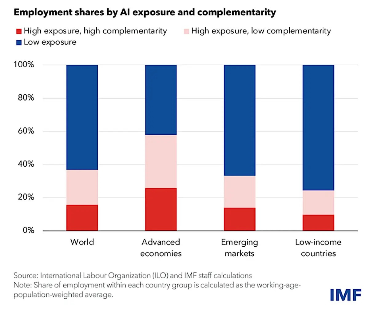 국제통화기금(IMF)이 내놓은 보고서에 따르면, AI는 전 세계 고용의 약 40%에 영향을 미칠 것으로 예상된다. 더 놀라운 것은 선진국에서 그 비율이 60%에 달할 것이라는 전망이다. 이는 거의 모든 산업 분야가 AI의 영향을 받게 될 것임을 시사한다.