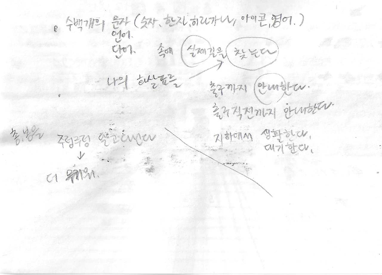 분명 내 출구는 A9이라고 하는데. 수많은 출구 중 분명 나만의 화살표를 찾았는데. 화살표를 쫓아 계단을 내려가고 기둥을 돌면 어느새 화살표가 사라졌다. 후. 다시 처음부터. 광장으로 돌아가 다시 A9을 찾아가면 이번에는 다른 전철 노선을 타는 통로가 나온다. 행인에게 물어봐도 모른다. 아마 그들도 이 많은 길에서 자신의 길만 외우고 다닐 것이다. 화살표가 왜 사라지냐고! 일단 나가기라도 했으면 모를까 아직 지하인데! 기가 막힌 일이다. 관자놀이가 핑핑 돌고 숨이 가빠왔다. 세 번째 돌아간 광장에서는 어쩔 수 없이 역내 경찰서로 갔다. 나 같은 이에게 길을 손가락으로 짚어주던 경찰 옆에서 내 차례를 기다렸다. 나의 A9을 들은 경찰은 잠시 생각하더니 외운 듯한 유창한 영어 문장으로 “여기 출구가 많아서 힘드시죠. 저를 따라오세요.” 했다.