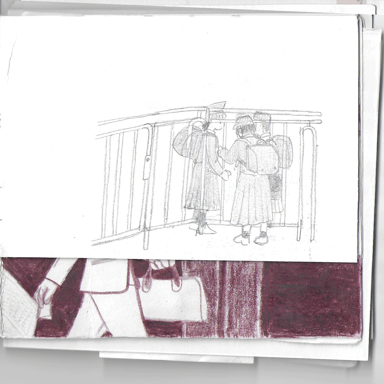 역에 도착했다는 안내방송이 나온다. 어른들 사이에 푹 파묻혀있던 초등학생 아이가 고개를 든다. 아이가 내리려고 끙차 일어날 때 작은 몸에 주렁주렁 걸어놓은 것들이 덜거덕거린다. 이 덜거덕을 덜컹덜컹 끼이익 박자에 맞춰가며 아이는 손잡이 없이 아슬아슬하게 중심을 잡는다. 무거운 가죽 모자 아래로 질끈 묶은 삐뚤어진 양 갈래. 소매에 숨은 고사리손을 그려본다.