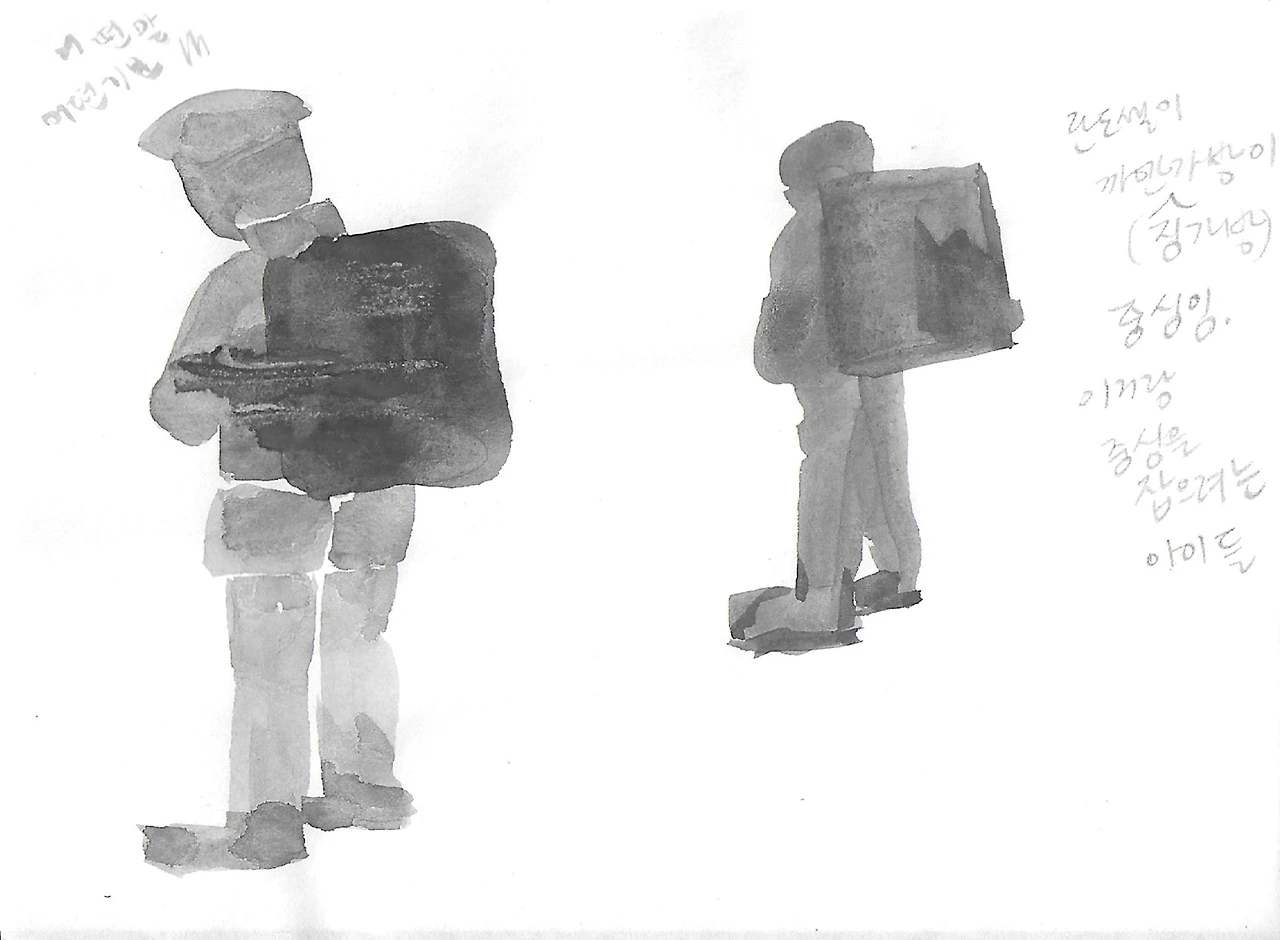 검은 막대 같던 아이의 잔상이 전철에 남아있다. 란도셀이라고 하는 아이의 몸통만 한 검정 가죽가방의 빈틈없이 단단한 모양이 SUV 타이어 같다. 일본 초등학교에는 사물함이 없어 학생들은 숙제할 교과서와 내일의 준비물을 매일 다 싸서 다닌다고 한다. 작은 몸집의 아이들은 한 뼘 큰 교복에 모자와 구두까지 갖춰 입고 흔들리는 전철에서 이 가방을 고쳐 매느라 쩔쩔맸다. 아니 나한테만 버거워 보이는 거지 아이들은 이미 익숙하다. 일어설 때, 기다릴 때, 발걸음을 옮길 때마다 이 등짐을 지다 나동그라지지 않게 균형을 잡는 일에 익숙하다.