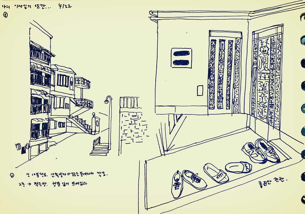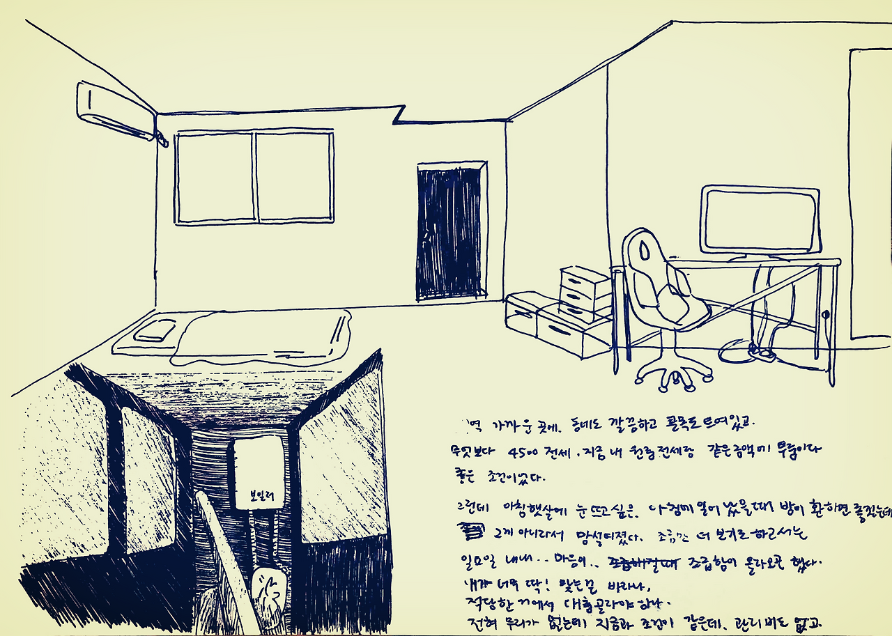 부동산 아저씨는 한 동네 골목에 차를 댔다. 고만고만하게 생긴 신축빌라 사이로 특이한 계단이 툭 튀어나왔다. 바로 저 집이란다. 오래된 3층 주택에 2층 집 하나가 전세 4500에 나왔다고 했다. 층마다 두 집뿐인 아담한 주택. 옆집하고 현관문 두 개가 사이좋게 딱 붙어있는 집. 대학생이 전세로 들어와 무슨 사정으로 만기를 한참 남겨두고 도중에 다른 곳으로 이사했다고 들었다. 엄마가 다른 집을 구해줬다고. 그래. 집에 돈이 많으면 그렇게도 할 수 있지. 어쨌든 그래서 전주인이 이 집에 올 때 산 새 가전제품 일체를 100만 원에 사는 조건이 딸려왔다. 어차피 투룸이란 옵션이 없으니 나도 전부 사긴 사야 한다. 세탁기, 냉장고, 전자레인지, 벽걸이 에어컨, 책상, 의자, 서랍 등 중고로 사도 어차피 그 정도 돈은 들 것이다.