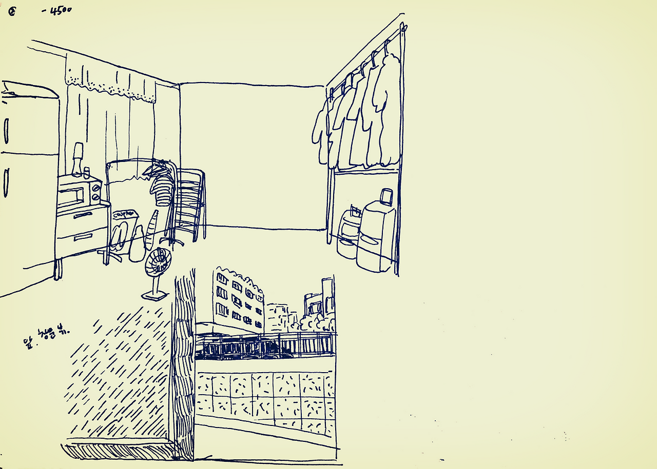 안방 격인 이 방은 싱글 침대와 책상 사이에 이부자리를 또 펼 수 있는 넉넉한 크기다. 그런데 큰 창문이 있는데도 방이 새까맣게 어두웠다. 창문 옆의 웬 검정 문짝을 열어보니 거기는 보일러실 겸 창고였다. 그곳의 창문을 열어야 밖인데 1.5미터 코 앞에 옆 건물이 딱 붙어 있었다. 내 집과 옆집 사이의 쿠션 같은 이 공간이 베란다가 아니라 보일러실이어서 방의 창문은 어차피 열 수 없어 갇힌 방이 되었다. 환기도 안되고, 옆 건물이 딱 붙어 있어서 비집고 들어올 채광도 없을 것이다. 차라리 창문을 내지를 말지, 기대나 안 하게…