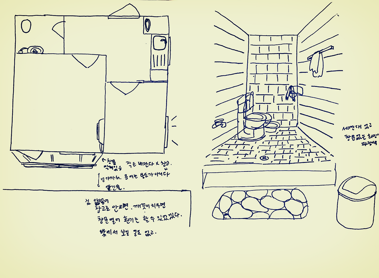 오른쪽 방문 옆에 바로 화장실 문이 붙어있다. 옛날 집들은 특이하게 화장실 문턱이 높더라. 보통은 물 튀지 말라고 그런 거지만 여기는 화장실 바닥도 그대로 한 뼘이 높다. (**왜 그런 거지?**) 세면대는 없어서 간이 세면대를 설치하던가 아니면 쪼그려 앉아서 세수해야 한다. 엄지손가락만 한 터키색 타일을 빽빽하게 바른 화장실엔 창문이 없어서 들어가 문을 닫으면 SF영화 속 우주선처럼 무중력 상태의 큐브에 갇힌 듯했다. 신비한 이 화장실을 환기시키려면 화장실 문을 열고 현관문도 밖으로 조금 열어놔야 할 것 같다.