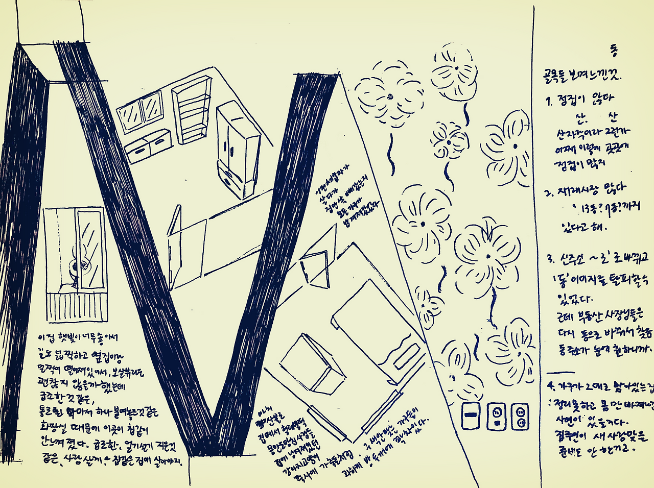 그리고 나중에 엄마와 얘기하다가 알게 됐는데, 살림살이가 다 남아있는 것은 아마 이전 세입자가 새집으로 이사 가며 전부 새 가구를 들이기로 했거나, 사정이 생겨서 살던 곳 정리도 못하고 몸만 쏙 빠져나간 걸 거라고 했다. 집주인 역시 새 사람 맞을 준비를 안 하고 있는 거고. 다시 떠올려보니 벽 군데군데 다른 무늬의 벽지가 마치 구멍 난 양말 기우듯 한 두 폭씩 대충 발라져 있었고 가구가 다 구색이 안 맞던 것도 생각났다.
