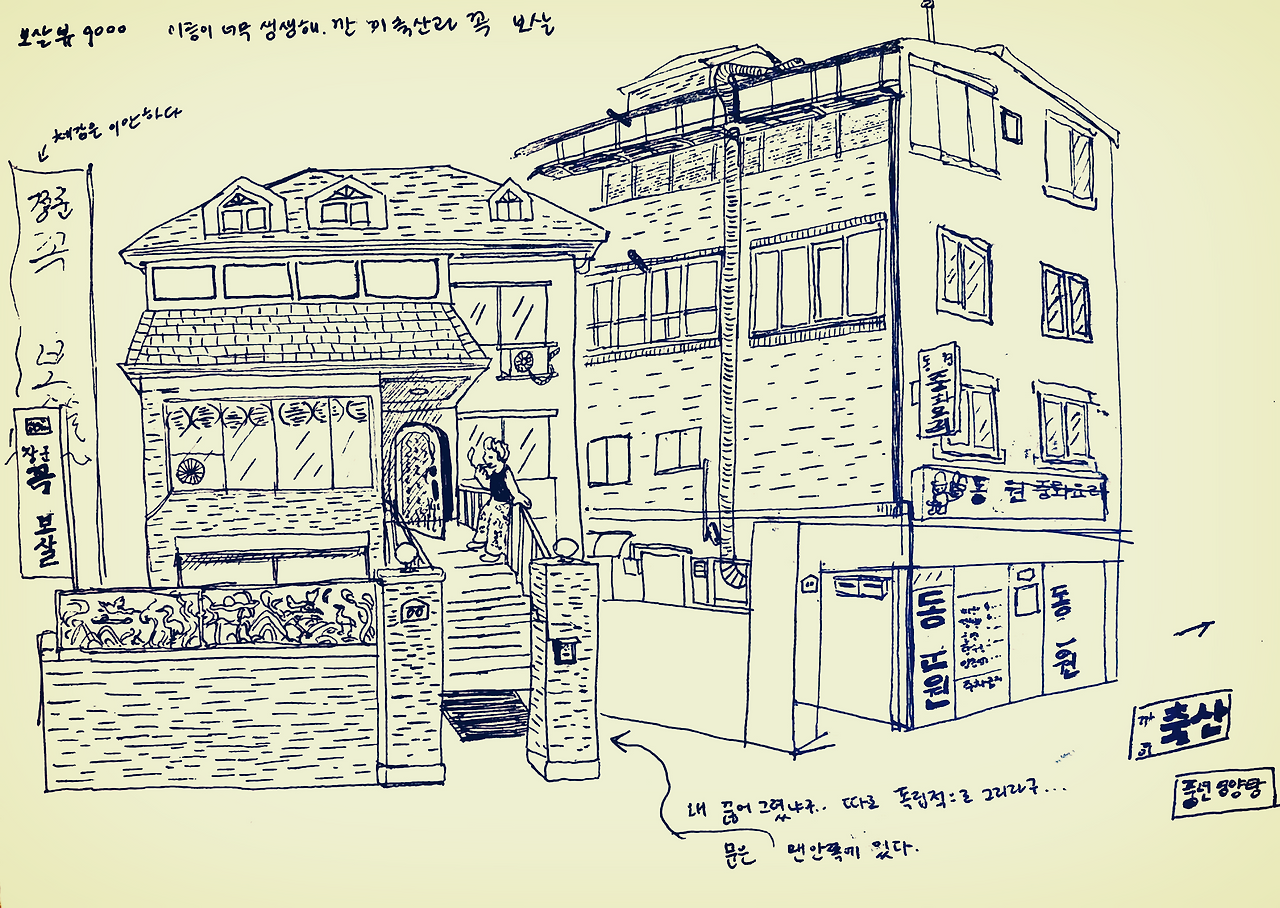 시장 골목밖에도 상점이 많다. 집 가는 길이 축산파트였는지 깐두리 축산, 풍년 영양탕, 사철탕,, 웬만하면 육류 음식을 피하는 나로서는 읽기 괴로운 간판이었다. 요즘 정육점은 고기든 뼈든 다 토막내서 팩 째로 냉장고에 넣어놓는데, 여기는 아직 옛날 스타일로 해체한 고깃덩어리를 쇠꼬챙이에 축 걸어놓는 집이 있다. 털을 벗겨낸 두껍고 허연 살가죽과 비계, 시뻘건 층이 뒤섞인 덩어리와 내 눈이 접촉사고. 으악. 빨리 잊고 싶어서 눈을 꼭 감았다 떴다. 이 집에 오게 된다면 다른 길을 찾아야 할 것 같다.