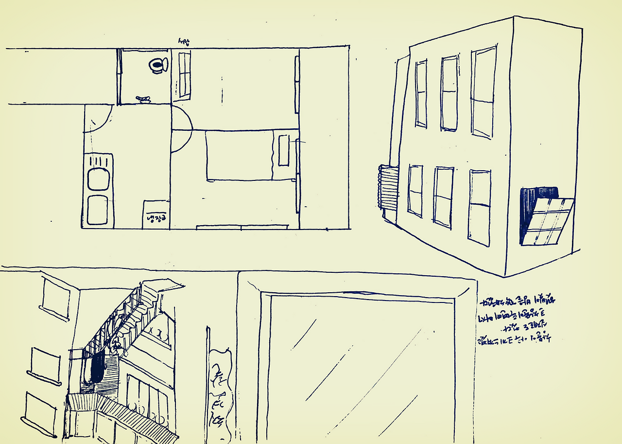 두 사람 들어서면 꽉 차는 작은 주방에 투도어 냉장고가, 안방엔 장롱, 책꽂이, TV 선반, 거울이 있고 보살 뷰 작은 방에도 싱글 침대, 전자레인지, 김치냉장고까지 모두 쓰라고 살림살이 새로 살 필요 없다고 한다. 이전 세입자는 어떻게 가전가구를 다 남기고 갔지? 죄다 별로 쓰고 싶지 않은 손때 묻고 시트지 벗겨진 어정쩡한 가구였지만 그래도 쓸 것만 골라서 쓰면 되니까. 이 집을 어쩔까 하면서 현관을 나서는데 현관문 밖 복도에 슬레이트로 대충 칸을 막아서 만든 화장실이 있었다. 아차! 화장실을 이제야 보다니. 덜컹거리며 열리는 이 철제문 안에 유리창문 옆으로 변기와 샤워기가 덩그러니 붙어있었다.