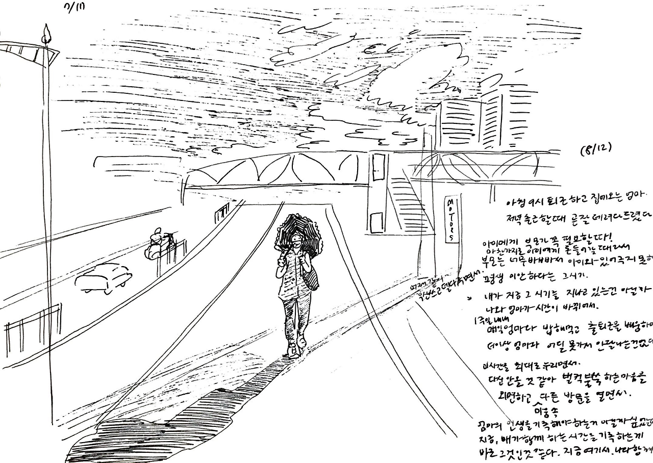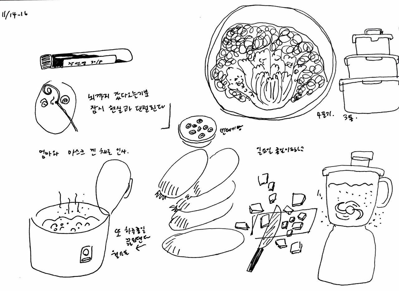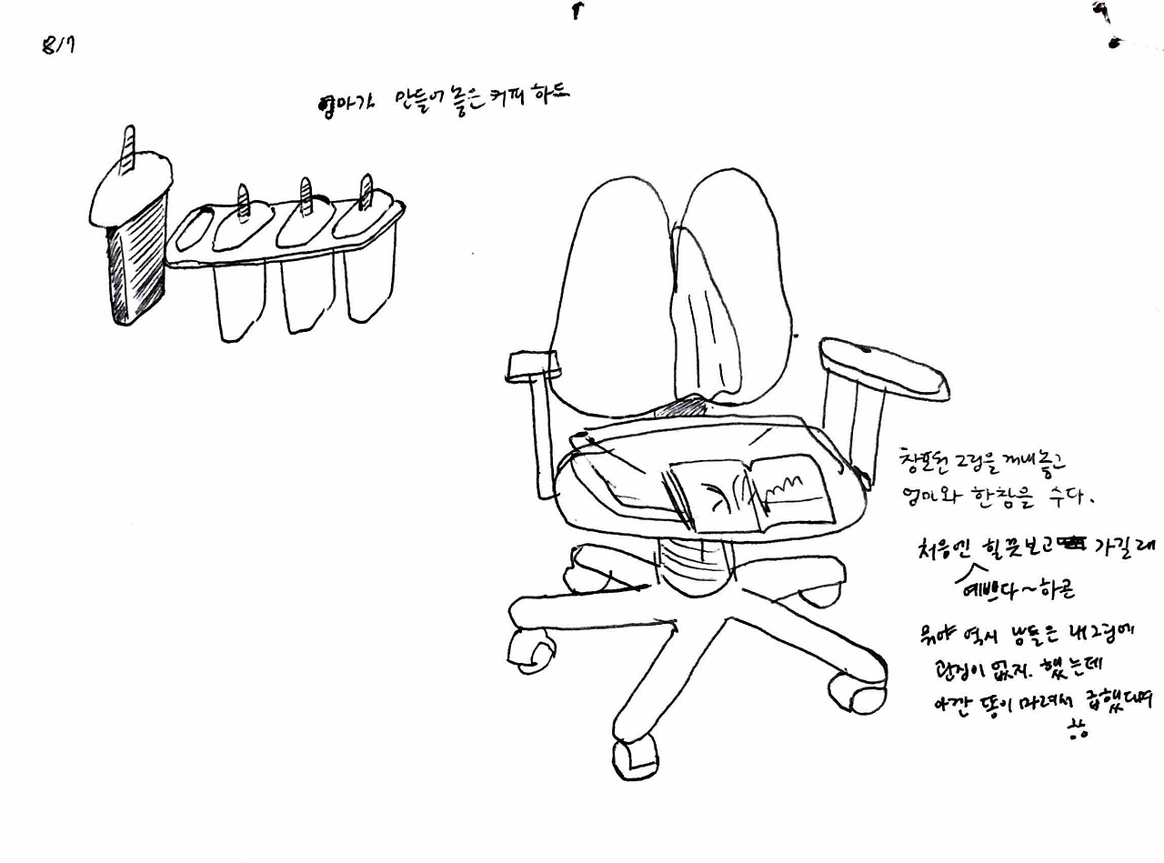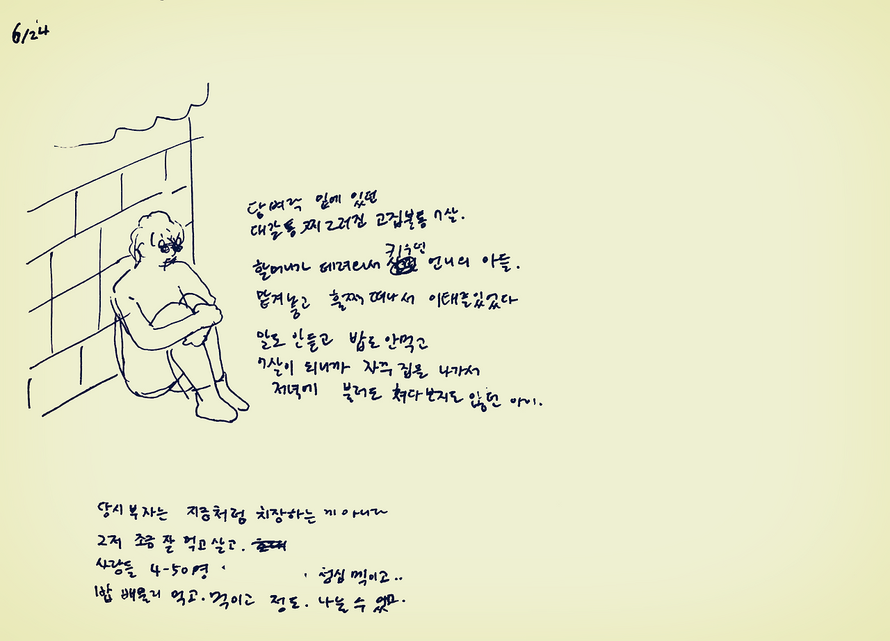 엄마는 그 아이 머리통이 찌그러져있었다면서 ‘너 대갈통 찌그러진 사람이 얼마나 고집불통인지 모르지? 관상이 진짜 그렇다’ 하며 가여운 아이를 회상했다. ‘엄마! 애기한테 대갈통이 뭐야 ㅋㅋㅋ’ 엄마 얘기를 듣는데 눈물이 핑 돌았다. 부모에게서 자기 자리를 못 찾는 아이들의 초라함과 처량함. 담벼락 밑에 쪼그려 앉은 대갈통 찌그러진 아이를 연기하는 엄마가 웃겨서 수첩에 그리다가 둘 다 눈물이 그렁그렁해져서는 그 아이 지금은 잘 살겠지 하고 둘이 엉엉 울었다.
