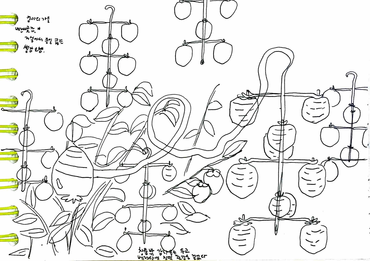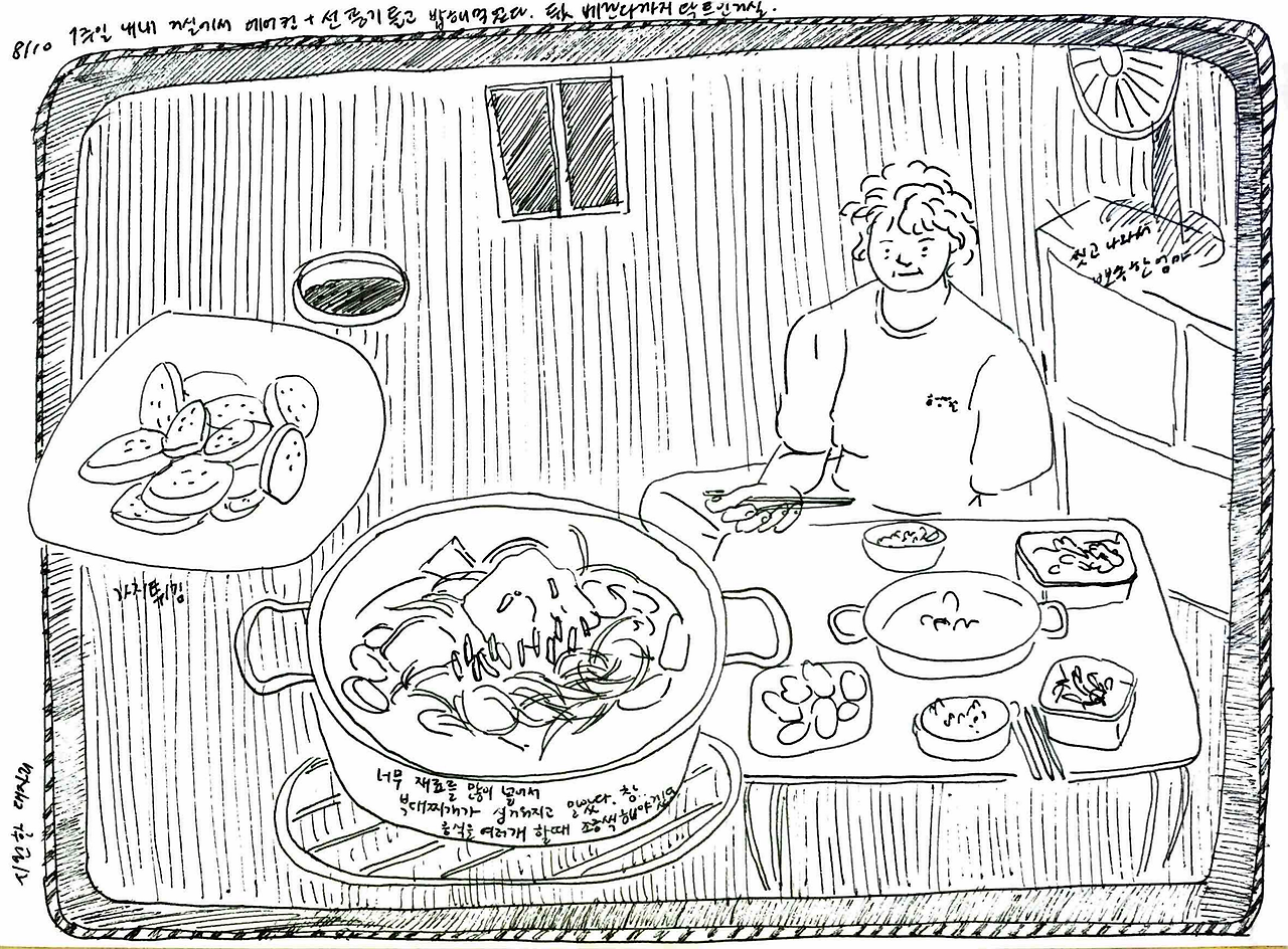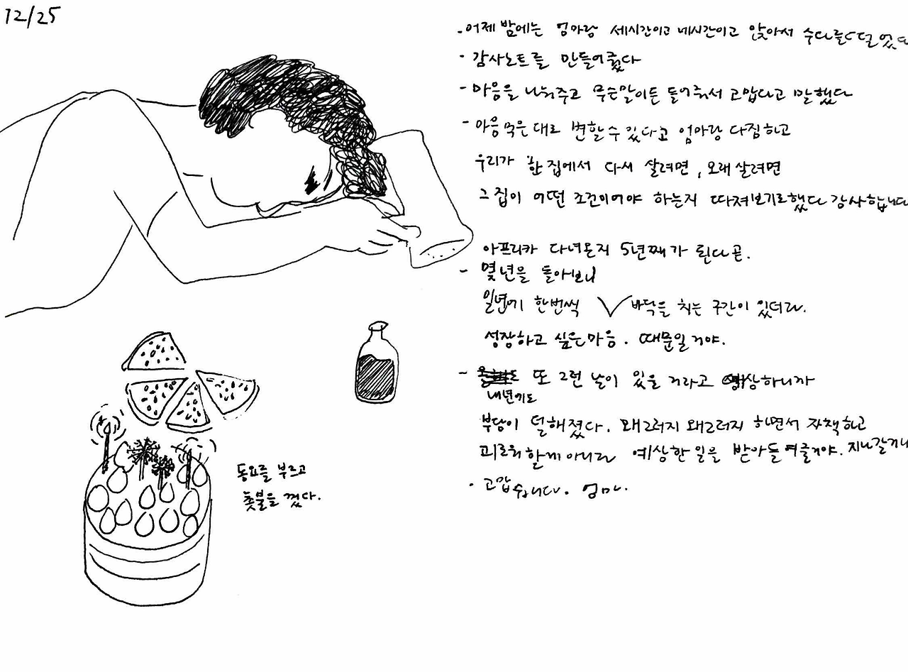 엄마는 그 아이 머리통이 찌그러져있었다면서 ‘너 대갈통 찌그러진 사람이 얼마나 고집불통인지 모르지? 관상이 진짜 그렇다’ 하며 가여운 아이를 회상했다. ‘엄마! 애기한테 대갈통이 뭐야 ㅋㅋㅋ’ 엄마 얘기를 듣는데 눈물이 핑 돌았다. 부모에게서 자기 자리를 못 찾는 아이들의 초라함과 처량함. 담벼락 밑에 쪼그려 앉은 대갈통 찌그러진 아이를 연기하는 엄마가 웃겨서 수첩에 그리다가 둘 다 눈물이 그렁그렁해져서는 그 아이 지금은 잘 살겠지 하고 둘이 엉엉 울었다.