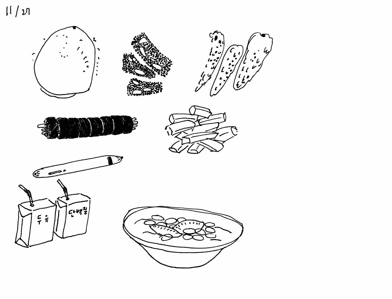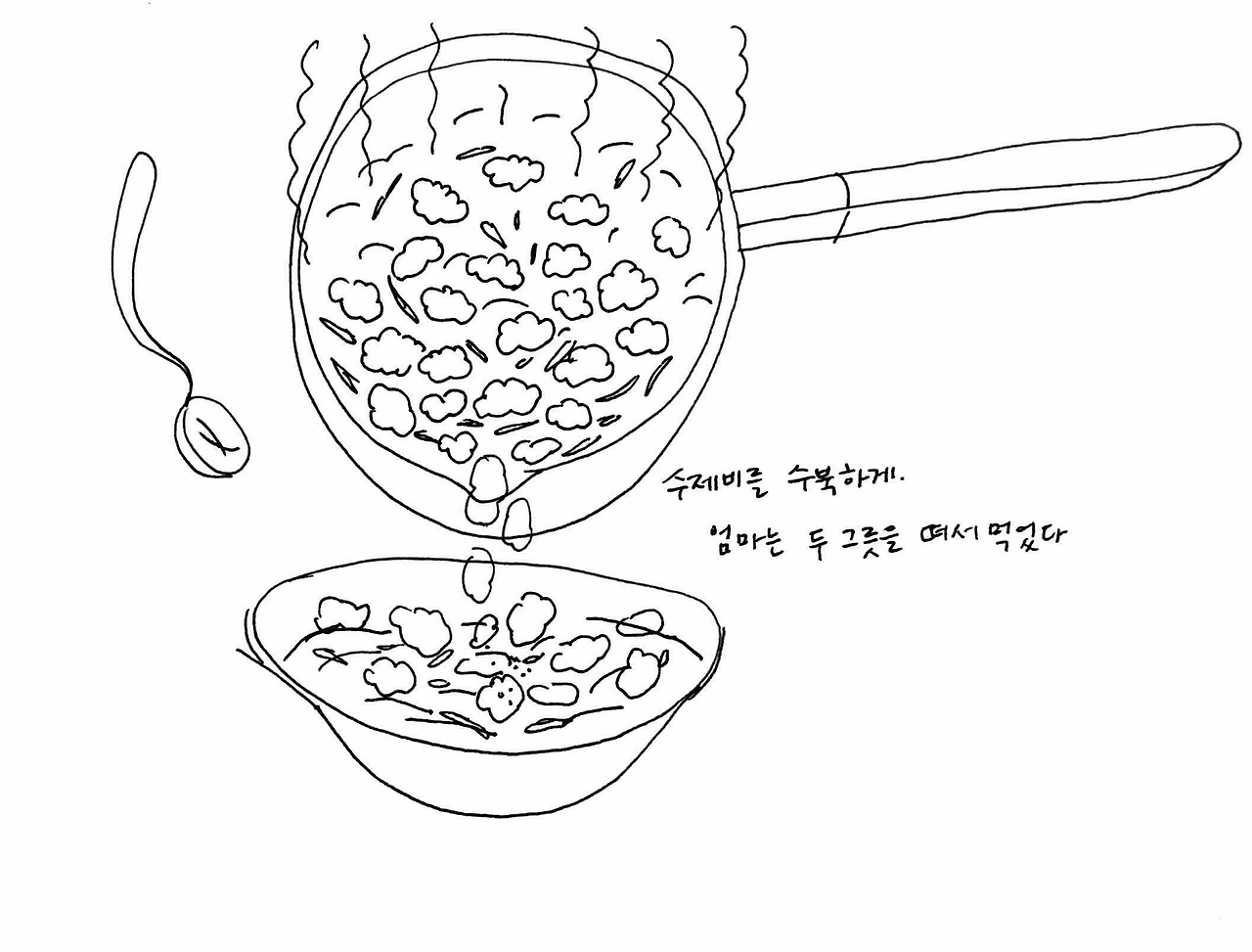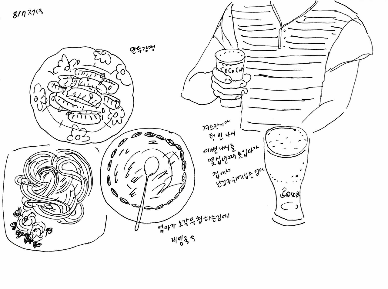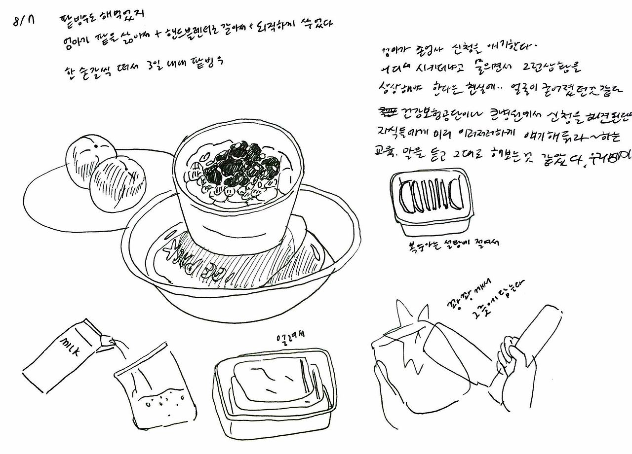 엄마는 그 아이 머리통이 찌그러져있었다면서 ‘너 대갈통 찌그러진 사람이 얼마나 고집불통인지 모르지? 관상이 진짜 그렇다’ 하며 가여운 아이를 회상했다. ‘엄마! 애기한테 대갈통이 뭐야 ㅋㅋㅋ’ 엄마 얘기를 듣는데 눈물이 핑 돌았다. 부모에게서 자기 자리를 못 찾는 아이들의 초라함과 처량함. 담벼락 밑에 쪼그려 앉은 대갈통 찌그러진 아이를 연기하는 엄마가 웃겨서 수첩에 그리다가 둘 다 눈물이 그렁그렁해져서는 그 아이 지금은 잘 살겠지 하고 둘이 엉엉 울었다.