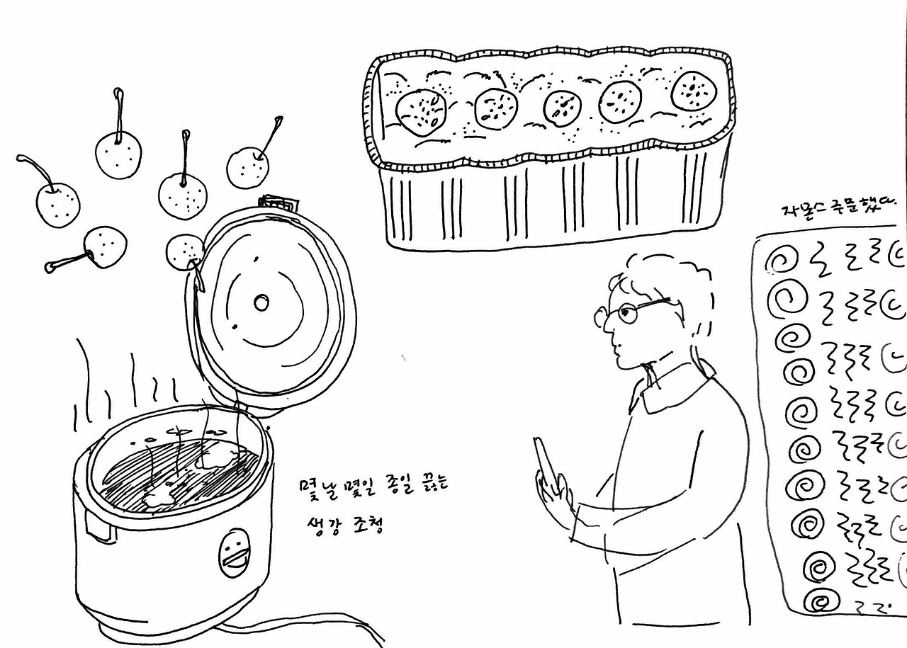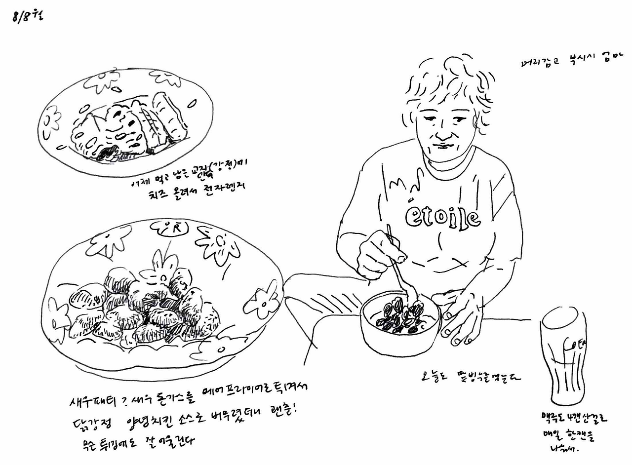 엄마는 이제 넓은 공간을 누비면서 요리를 더 크게 벌려놓고 한다. 인터넷으로 한약재를 골고루 시켜서 늘어놓고 말리고, 손이 많이 가는 약밥도 자주 해준다. 이번 여름에 엄마 집에 가면 며칠씩 지내다 오곤 했는데 매일매일 엄마와 저녁을 차려 먹는 것이 중요한 일과였다. 엄마 퇴근하는 시간에 맞춰 마중 나가서 마트에 들러 저녁거리를 사 온다. 집에 오면 엄마를 곧장 씻으라고 욕실에 들여보내고 나는 찬거리를 손질한다. 내가 요리 블로그 보면서 지지고 볶는 동안 씻고 나온 엄마가 수저 밥그릇을 챙기고 “엄마 우리 거실에서 먹을까?” 하면 “그래 에어컨 아래에서 먹자~” 하고 상을 펴고 앉아 배를 두드릴 때까지 먹었다. 그럴 땐 냉장고방에서 거실까지가 엄마의 주방이 된다.