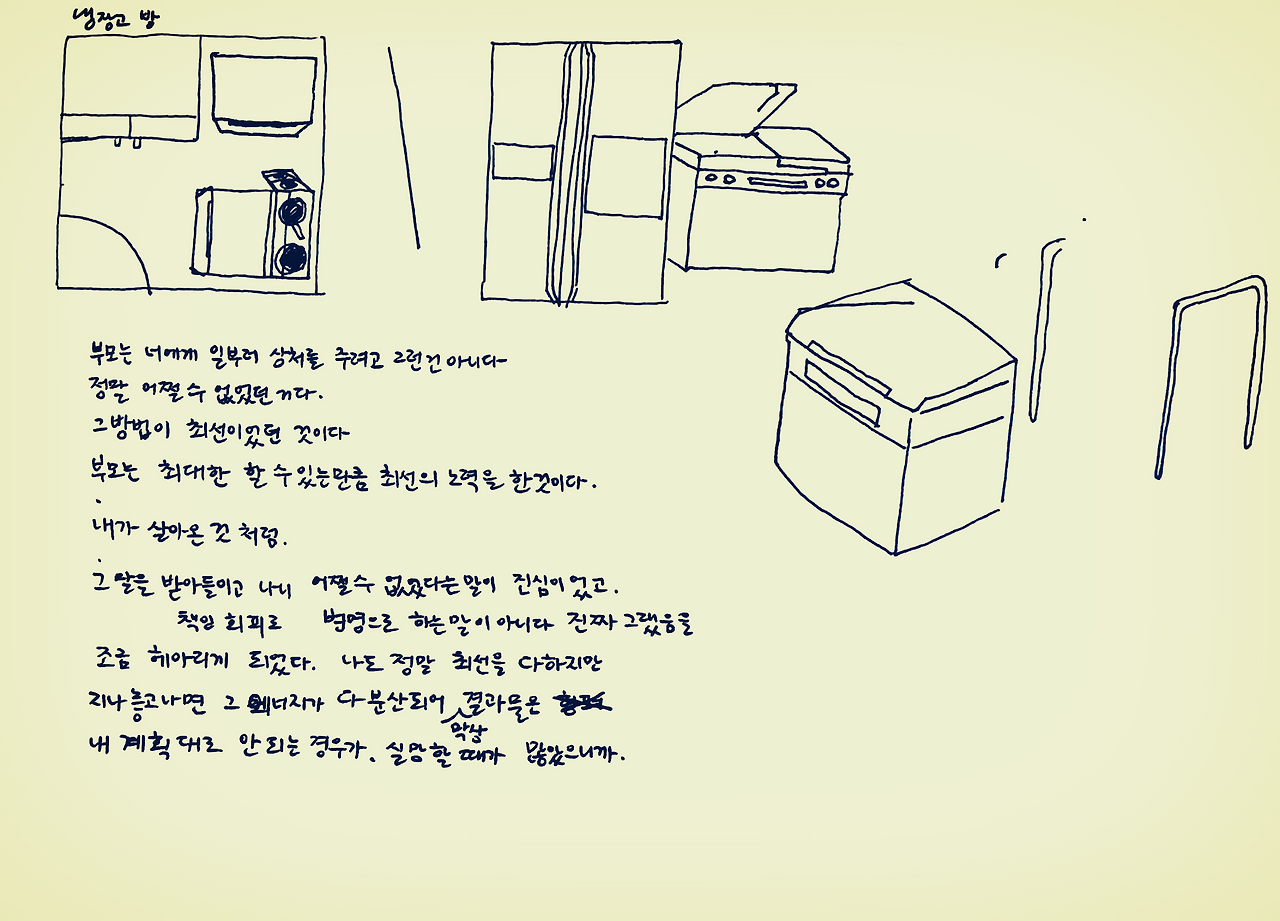 하마같은 기계 셋이 작은 방에 꽉 차서 여름 내내 이 방은 한증막 같았다. 방문을 닫고 뒷베란다로 뚫린 창문을 연 채로 종일 선풍기를 돌리고, 뭘 꺼낼 때는 발바닥 데일 세라 호다닥 꺼내왔다. 그래도 엄마는 넓은 주방과 냉장고 방을 하나 통째로 가지게 된 것을 뿌듯해했다. 이전 집에서는 냉장고 두 대만으로 거실 겸 주방이 꽉 차서 거실이라고는 싱크태 끝에 붙인 식탁 자리가 전부였다. 김치 꺼내려면 문 열고 베란다로 나가서 끙끙대며 김치통을 가져오고.