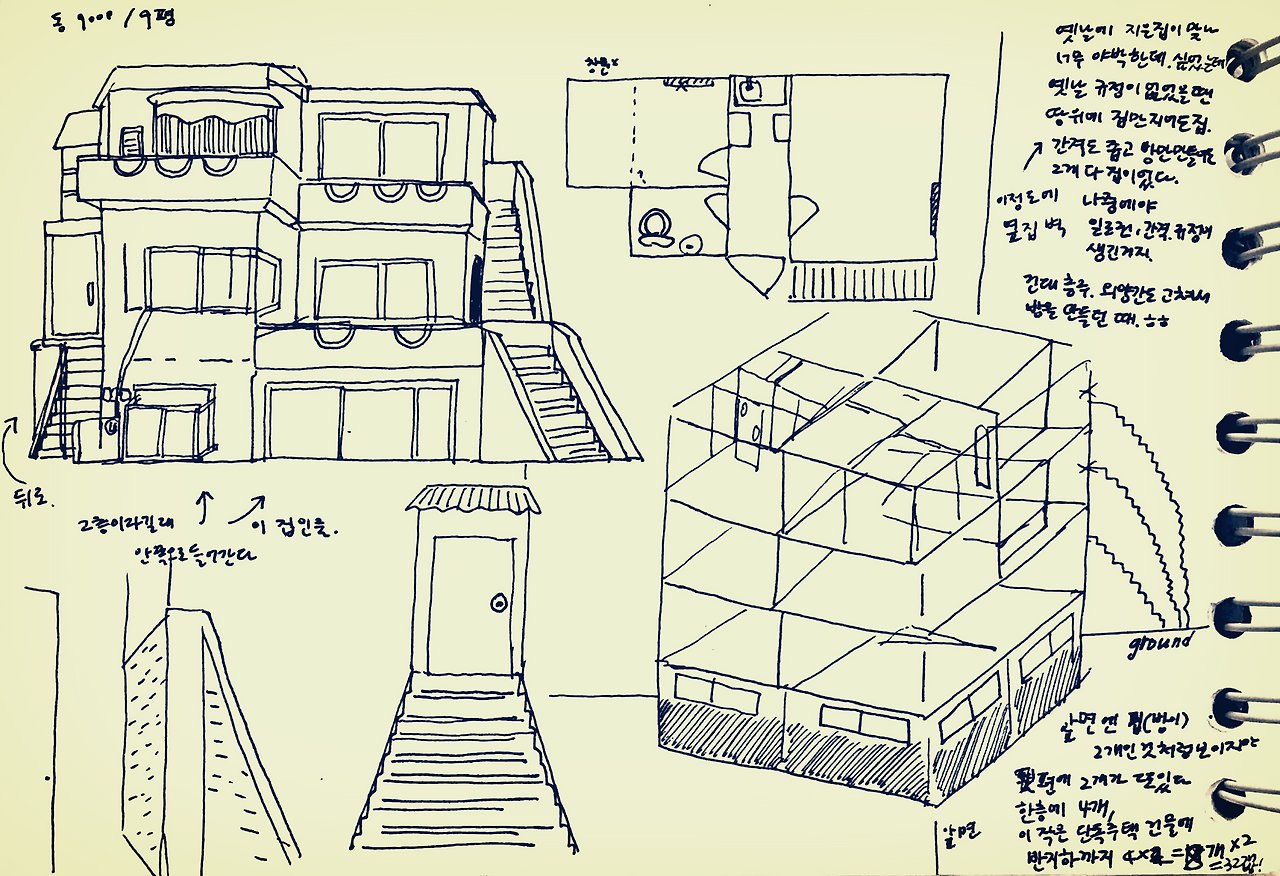 주택 뒷면에서는 앞과 양 옆이 담벼락으로 꽉 막혀있어서 현관이나 창문을 열어도 밖을 볼 수 있는 방향이 아니었다. 방이 거실을 두고 양쪽으로 있는데 작은방 쪽은 다른 집이랑 붙어있어서 창문이 없고 큰 방에 난 창문을 열면 방금 지나온 담벼락이 보였다. 간격이 1.5미터쯤 되려나. 이런 집이 9000만 원이라니. 이 동네에 오면서 보았던 동네와 집의 정면까지 마음에 들어서 그랬는지 어두운 집이 더욱 대조되어 속이 조금 상했다.
