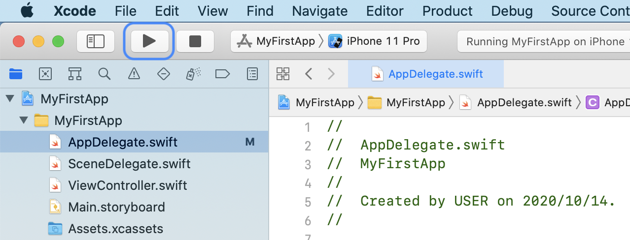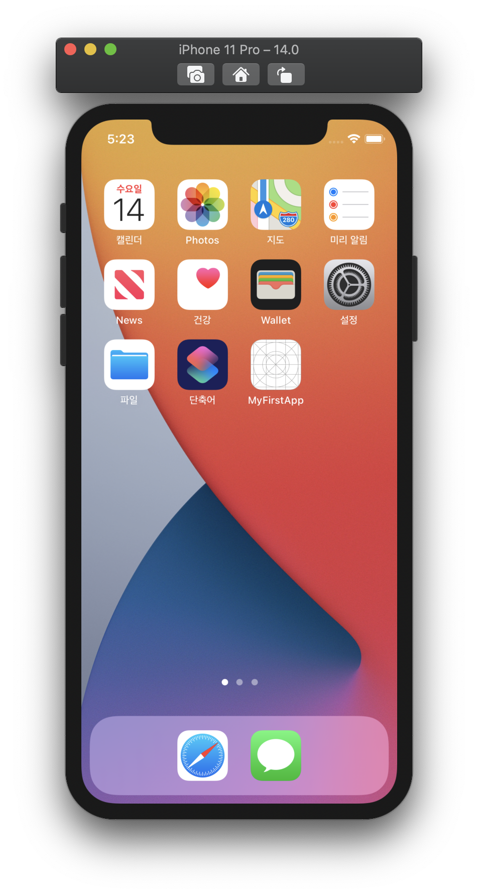 재생 버튼을 눌렀을 때 Simulator에 MyFirstApp 이 만들어진 것을 확인할 수 있습니다.