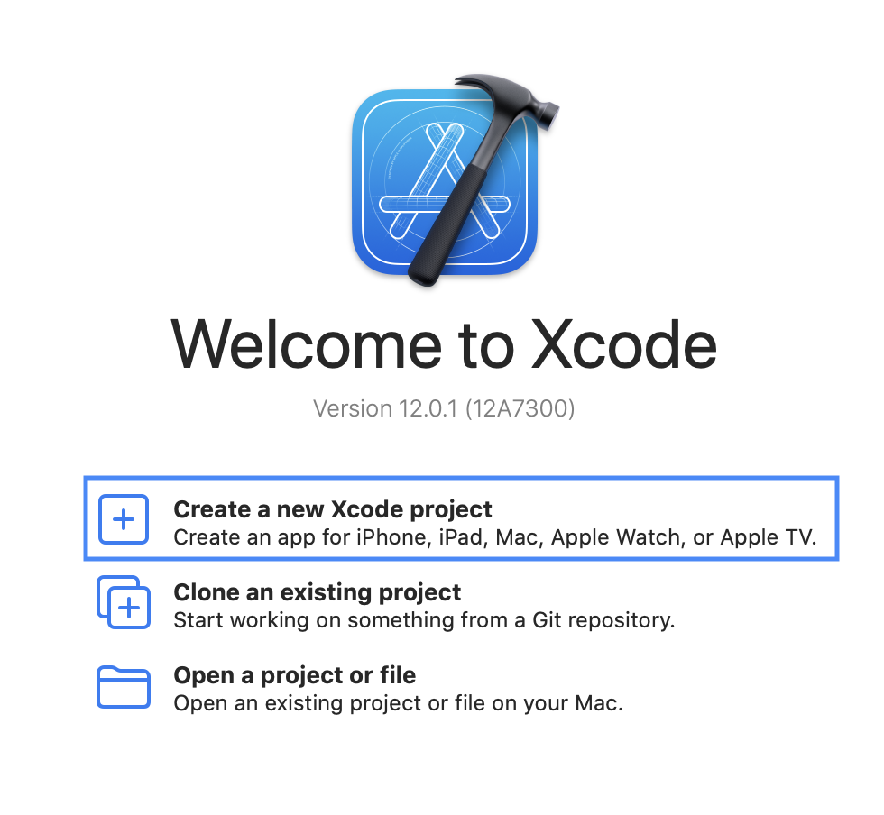 'Create a new Xcode project'를 통해 프로젝트를 만들 수 있습니다.
