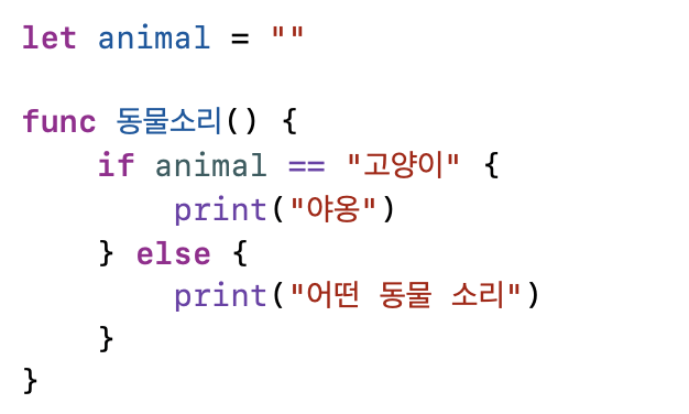 이 기능을 구현하기 위해선 if-else 문에 대해 먼저 공부해야 합니다. 동물 소리를 판단하는 함수를 만들어 보겠습니다. (단, 알고 있는 동물 소리는 고양이밖에 없다고 가정해봅니다.)