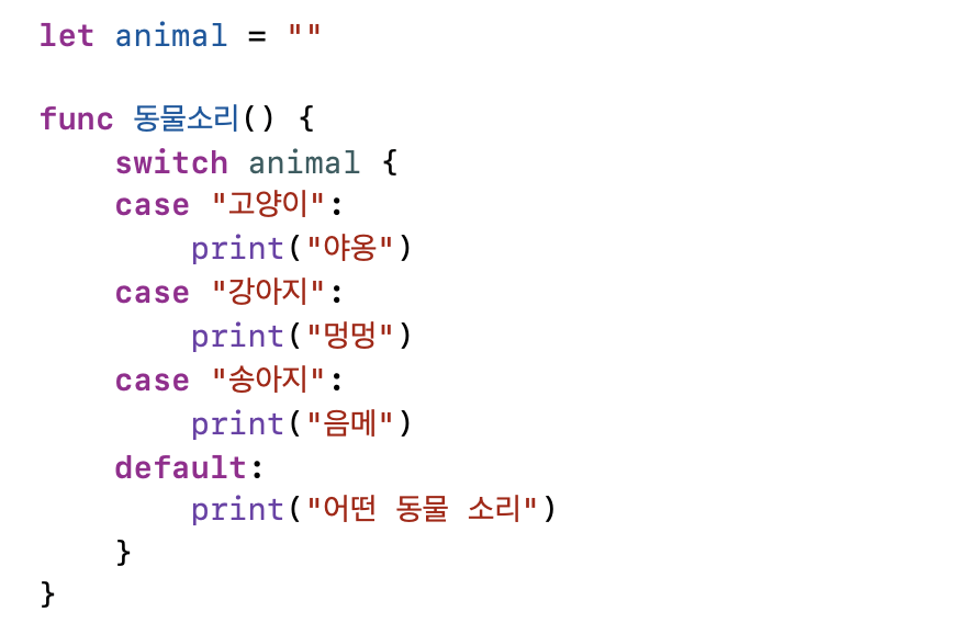 동물소리() 함수를 호출하면 animal에 따라 소리를 출력합니다.