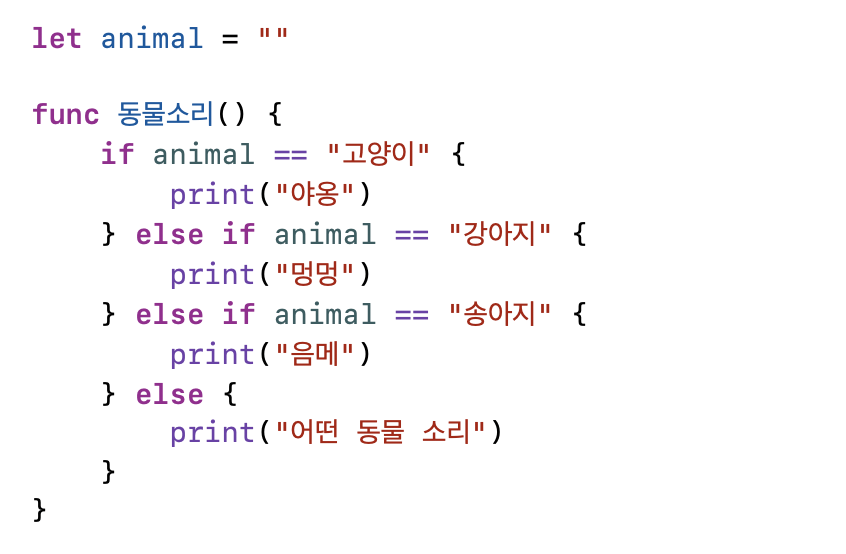 이런 경우, else 문을 사용합니다. 여기선 "어떤 동물 소리"를 출력하지만 else문은 if 조건이 아닌 경우 어떤 기능을 명령할 수 있습니다.