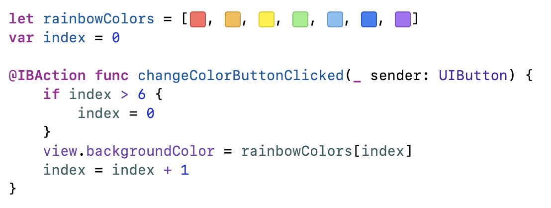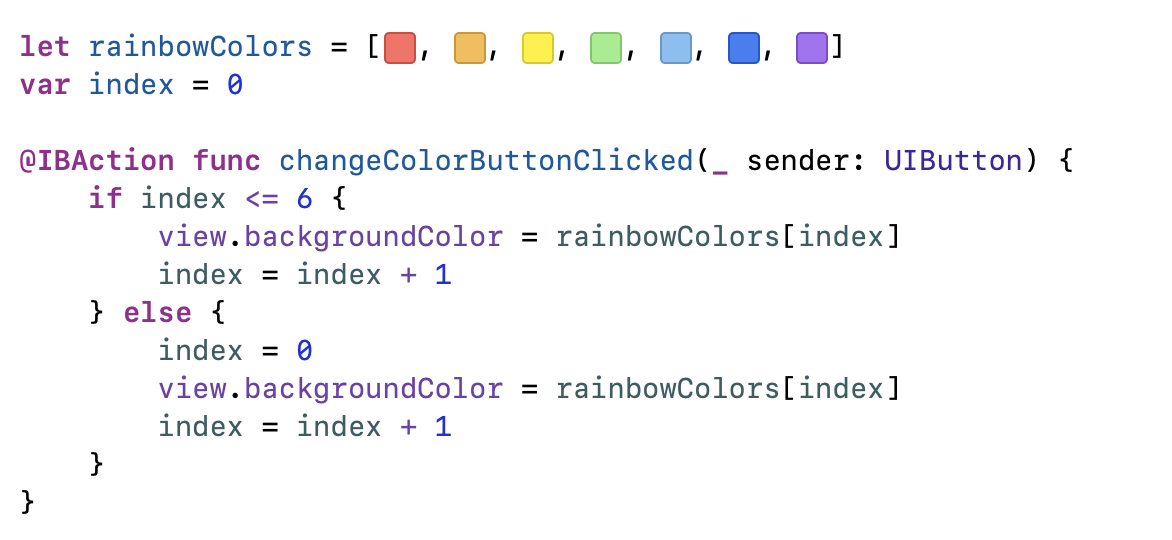 이전 글에서 "버튼을 누를 때 배경 색이 파스텔 톤의 무지개 색깔로 변경되며"까지 동작하는 것을 확인했습니다. "보라색이 되면 다시 빨간색으로 변경" 구현해보셨나요?
