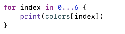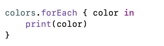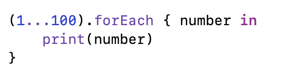 반복문을 사용하는 두 번째 방법으론 forEach라는 함수가 있습니다. 이 함수는 Swift가 제공하는 함수인데요, 범위에서 사용할 수 있습니다. 뒤에 변수 in 용법은 우선 넘어가도 좋습니다.