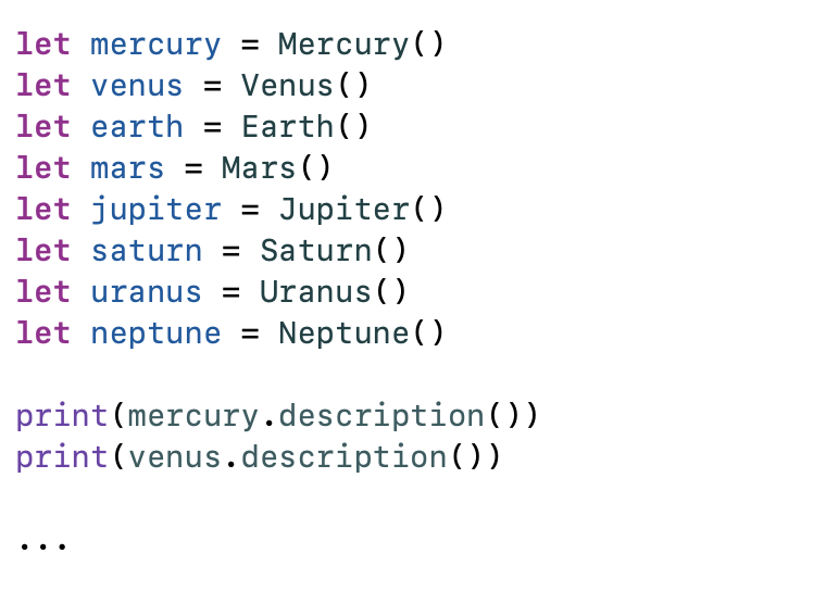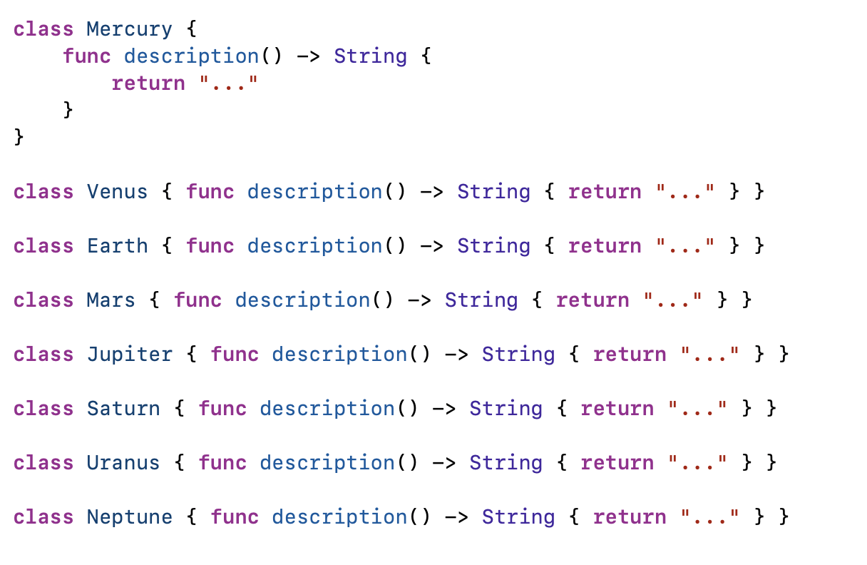 이 8개의 행성은 클래스 이름이 다릅니다. 클래스 이름이 다르다는 의미는 타입이 다르다는 것과 같습니다.