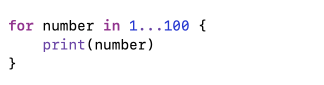 반복문은 이런 형태로 사용합니다. 1~100까지 출력이라면... 을 사용해서 범위를 지정해주고 이름을 붙여 하나씩 중괄호 안에 사용이 가능합니다.