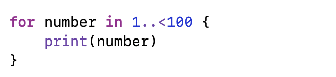 X...Y 이 X이상 Y이하였다면 X..<Y는 X이상 Y미만의 범위를 정할 때 사용합니다. 이렇게 범위를 정하면 이 예제에선 99까지 출력됩니다.